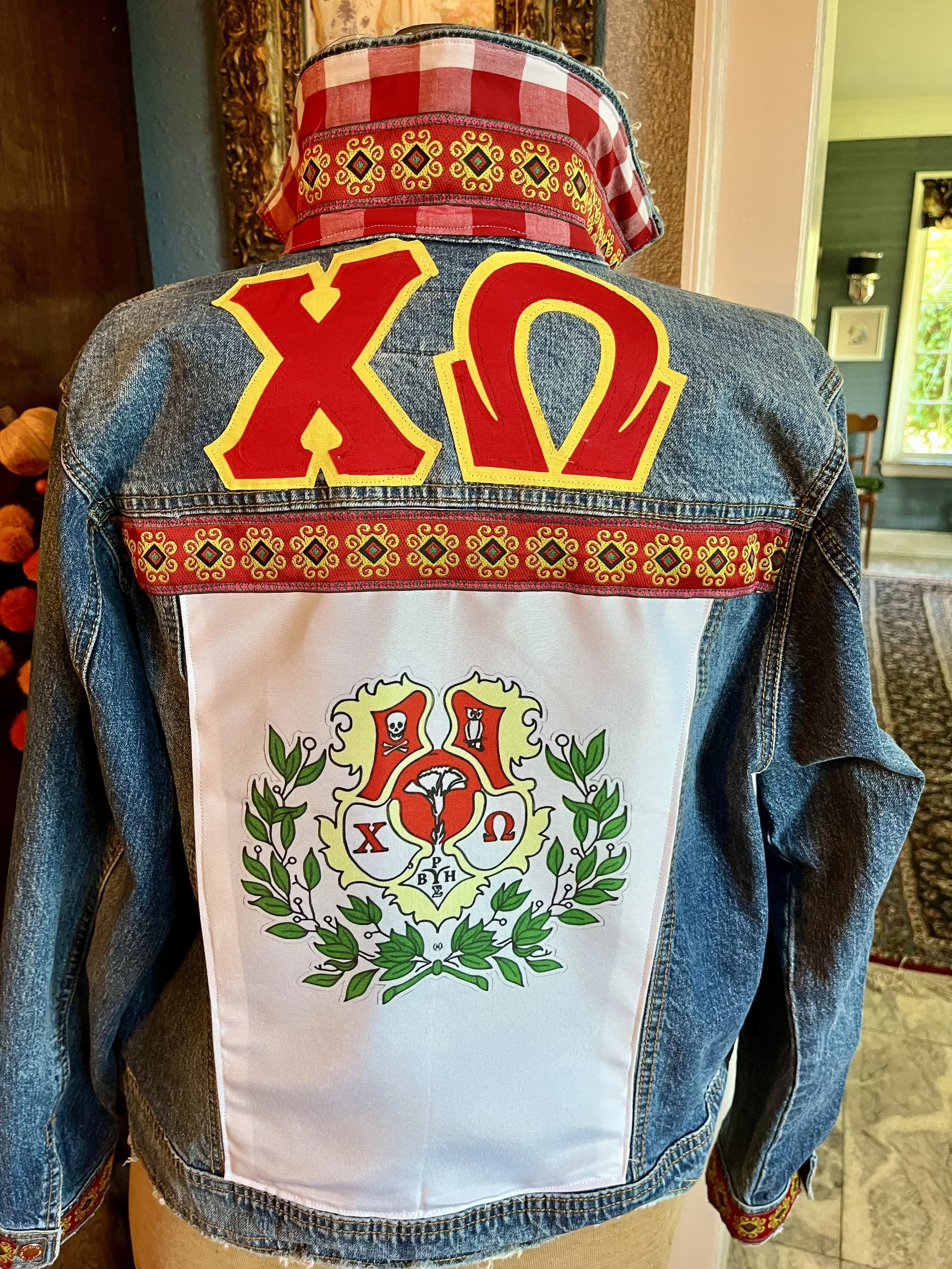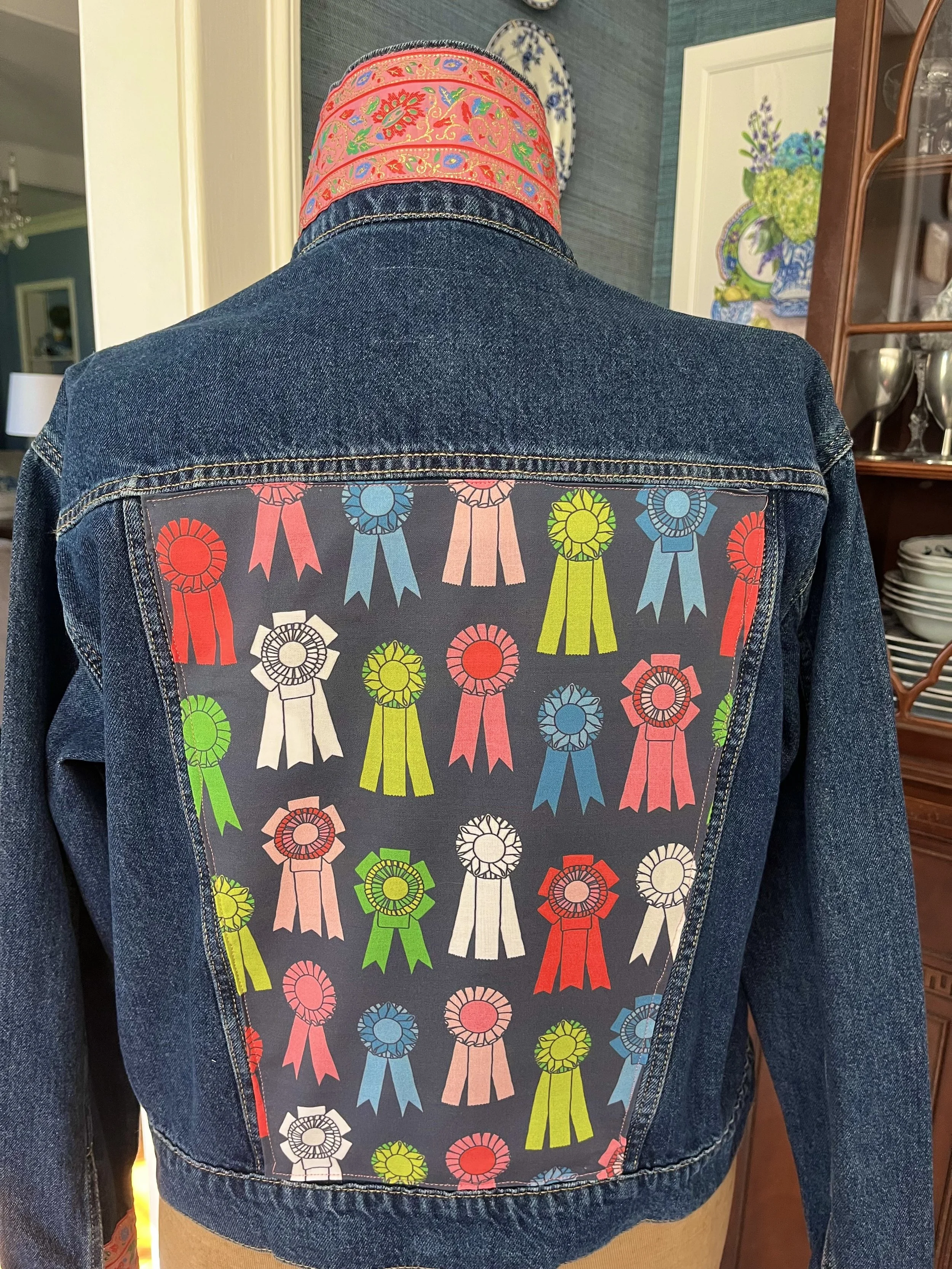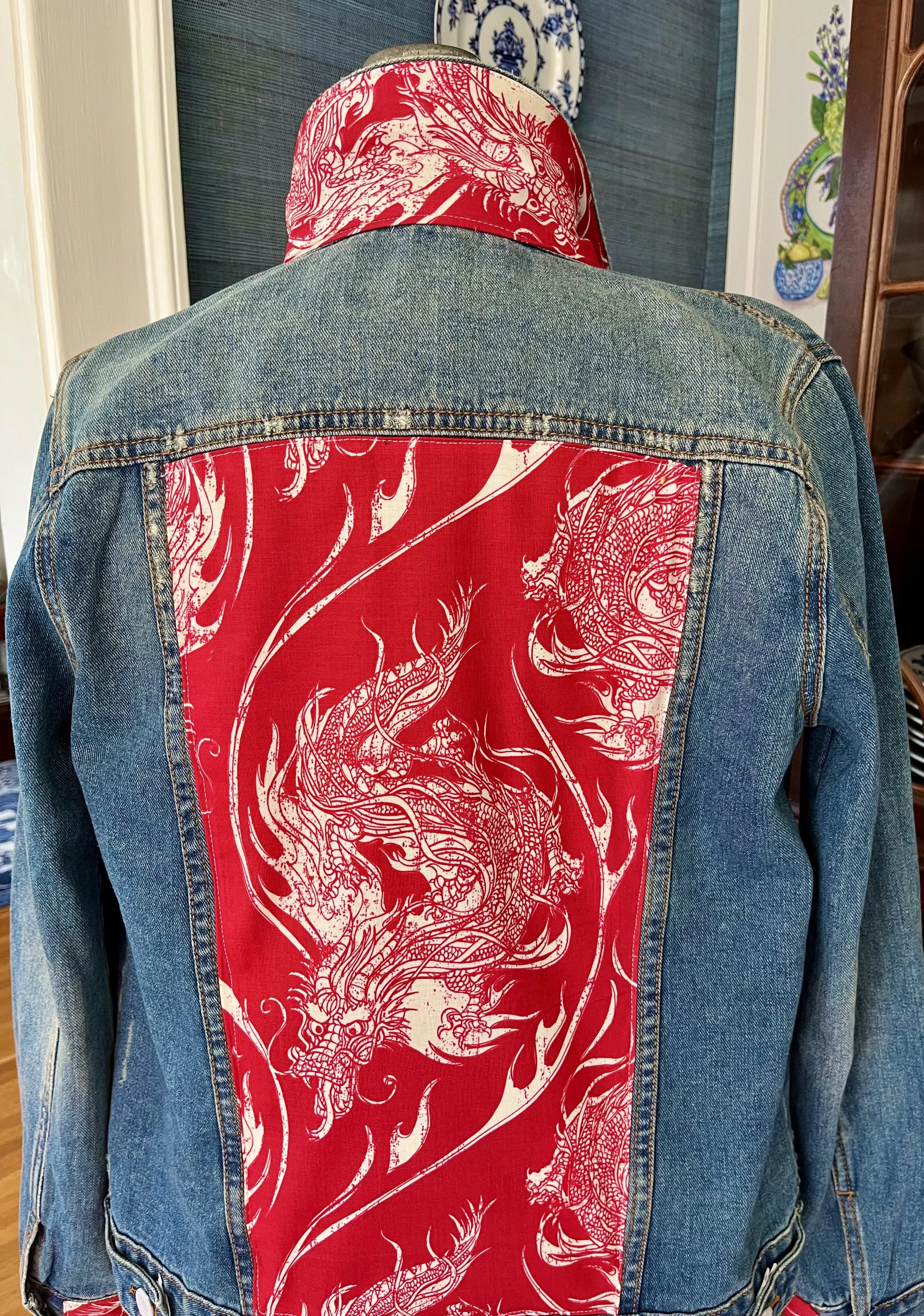 Classic denim jackets are transformed into wearable works of art through meticulous embellishments of designer fabrics, scarves, and appliqués. Each jacket is a statement of imagination, individuality, and creativity.