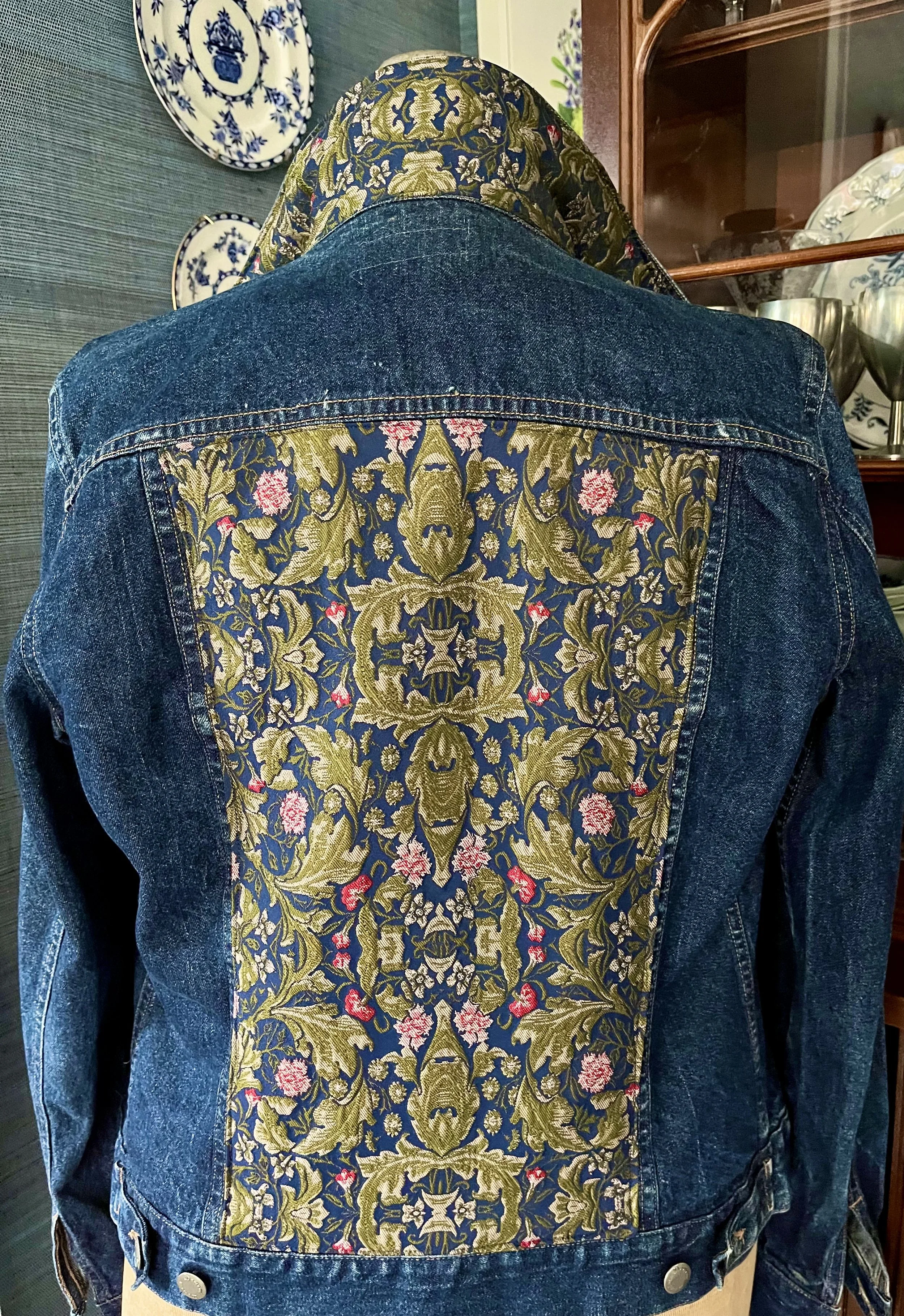 Classic denim jackets are transformed into wearable works of art through meticulous embellishments of designer fabrics, scarves, and appliqués. Each jacket is a statement of imagination, individuality, and creativity.