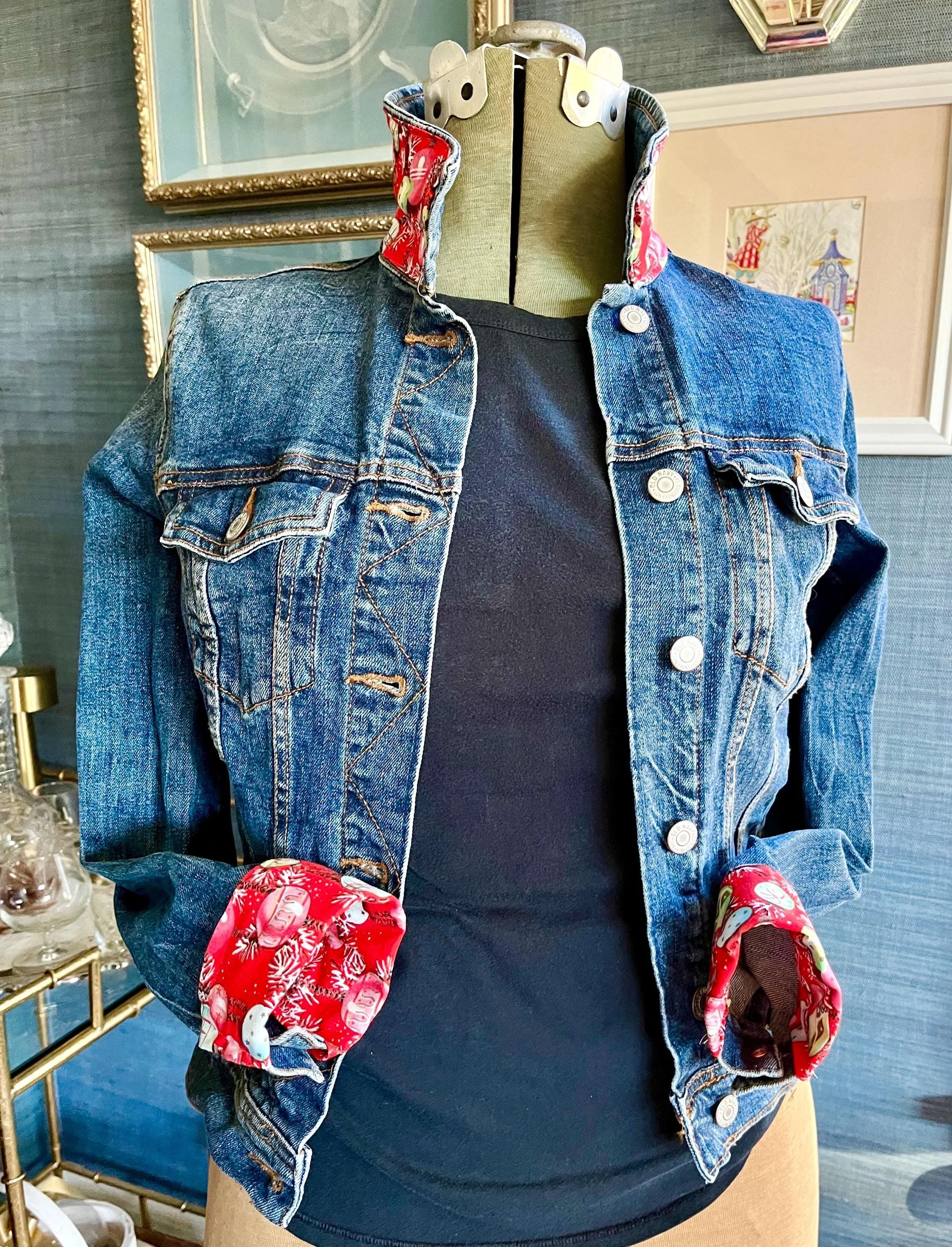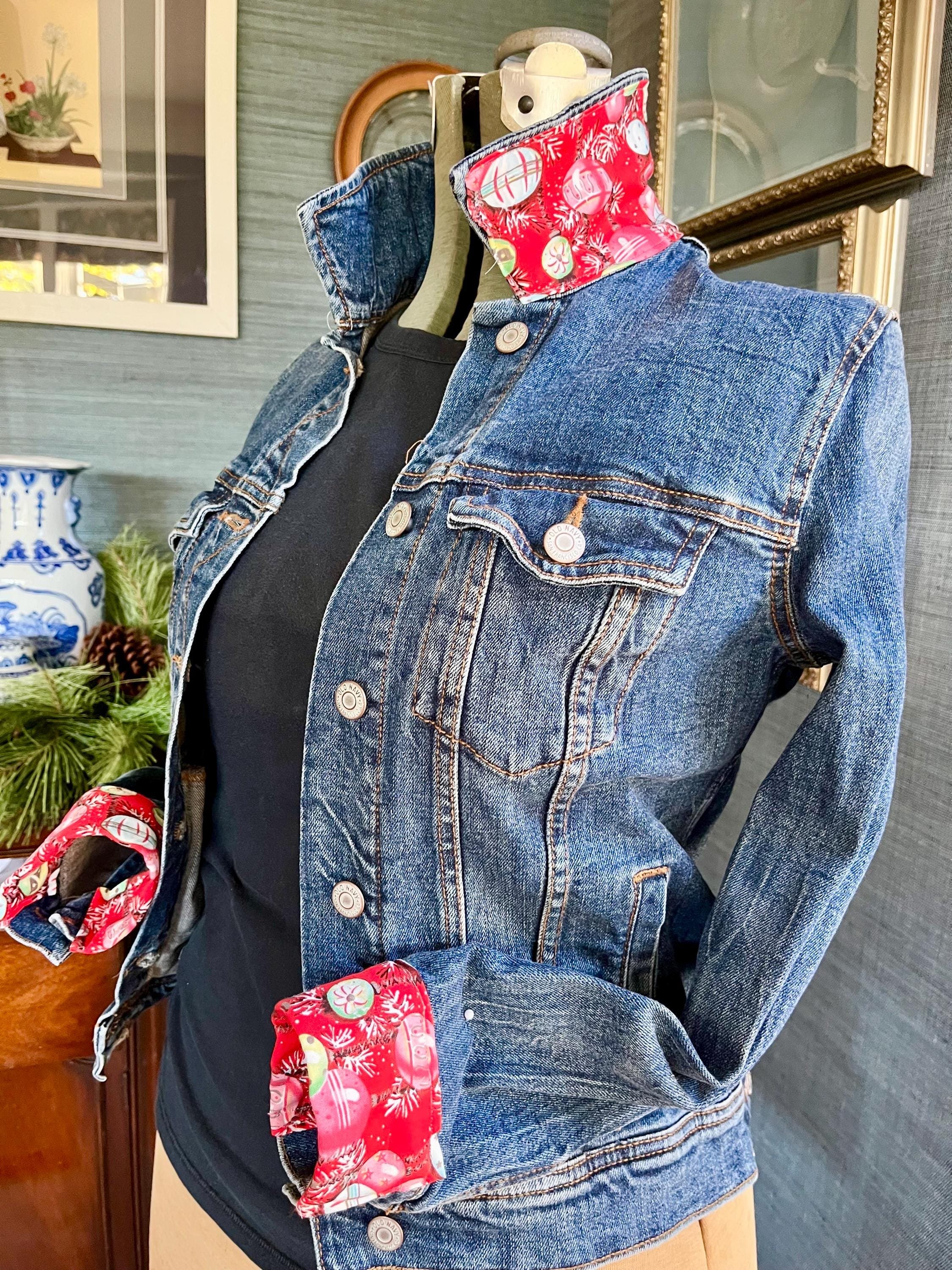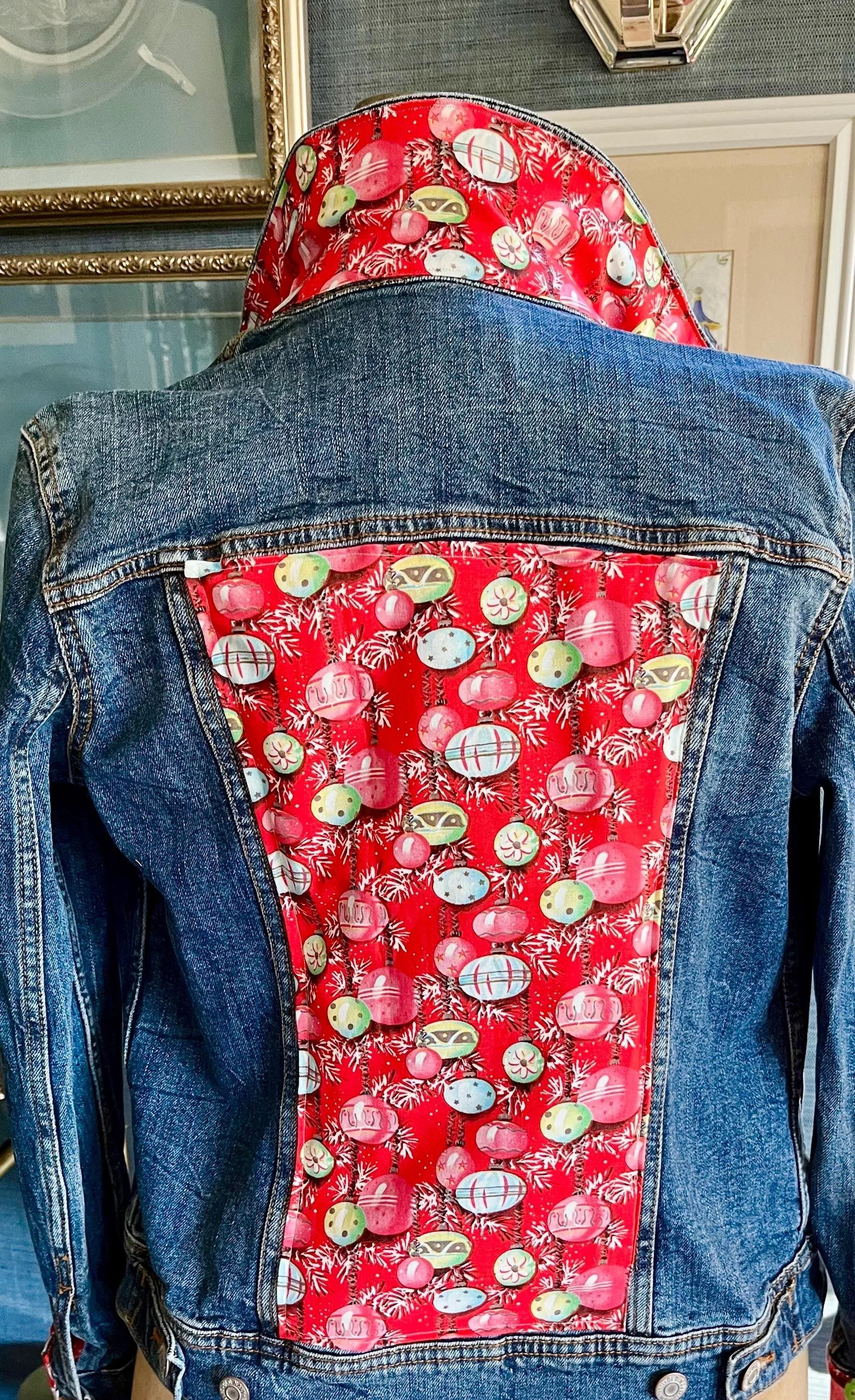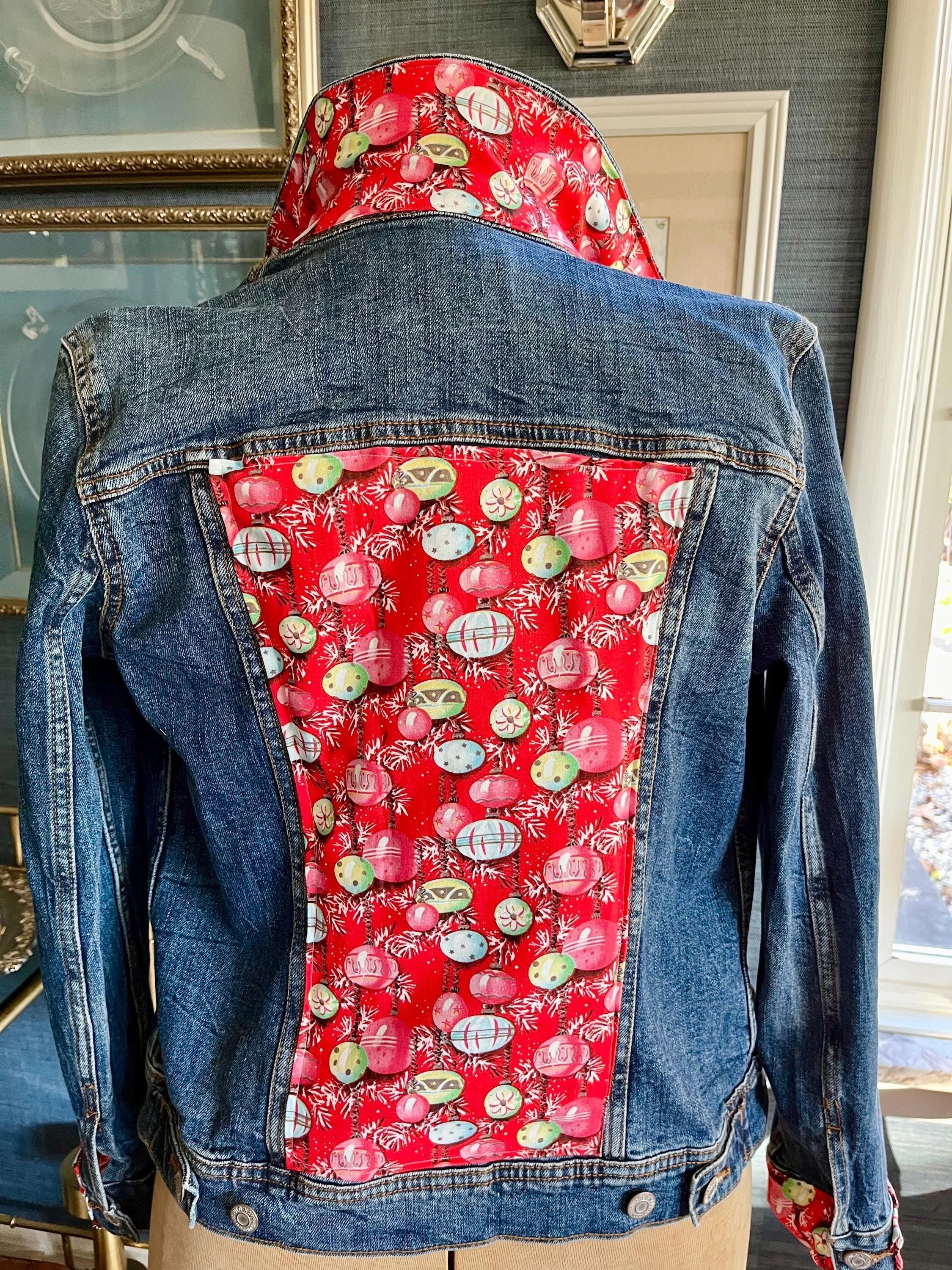 A vintage retro Christmas fabric embellished denim jacket is a charming fusion of festive spirit and classic style. This unique piece typically features a vibrant, holiday-themed fabric of ornaments and tinsel sewn onto the denim jacket. Perfect for holiday gatherings or adding a quirky touch to everyday outfits, this jacket showcases individuality and a love for the holiday season, making it a delightful statement piece for any wardrobe.