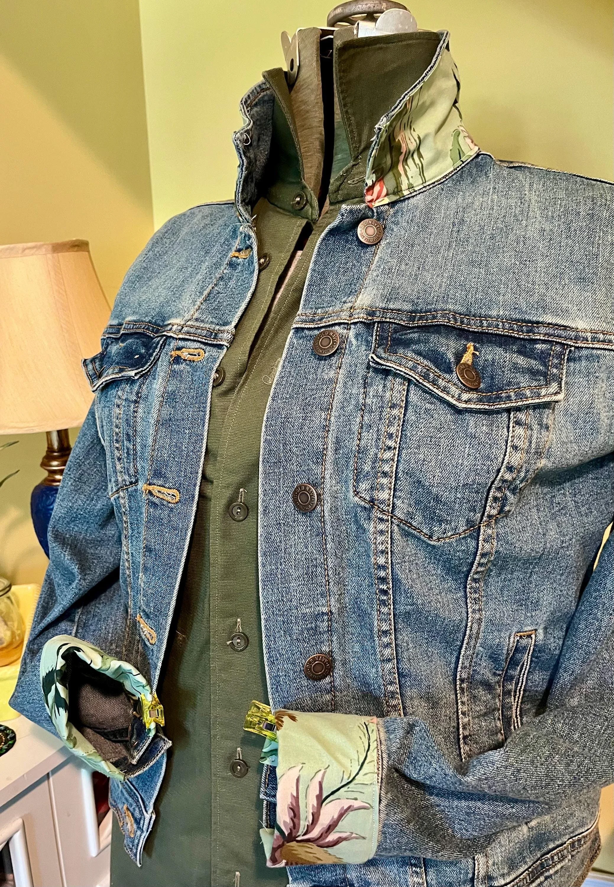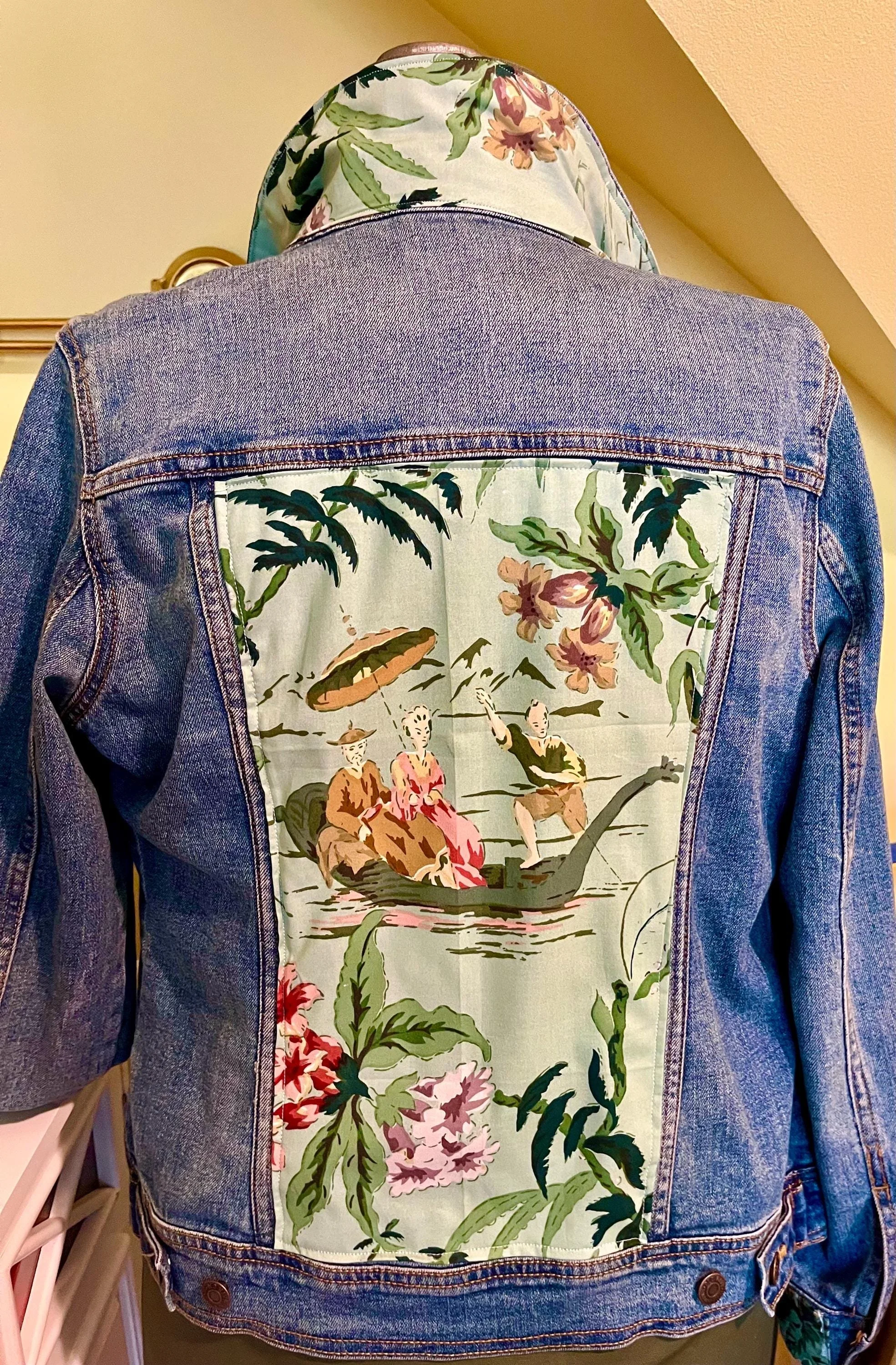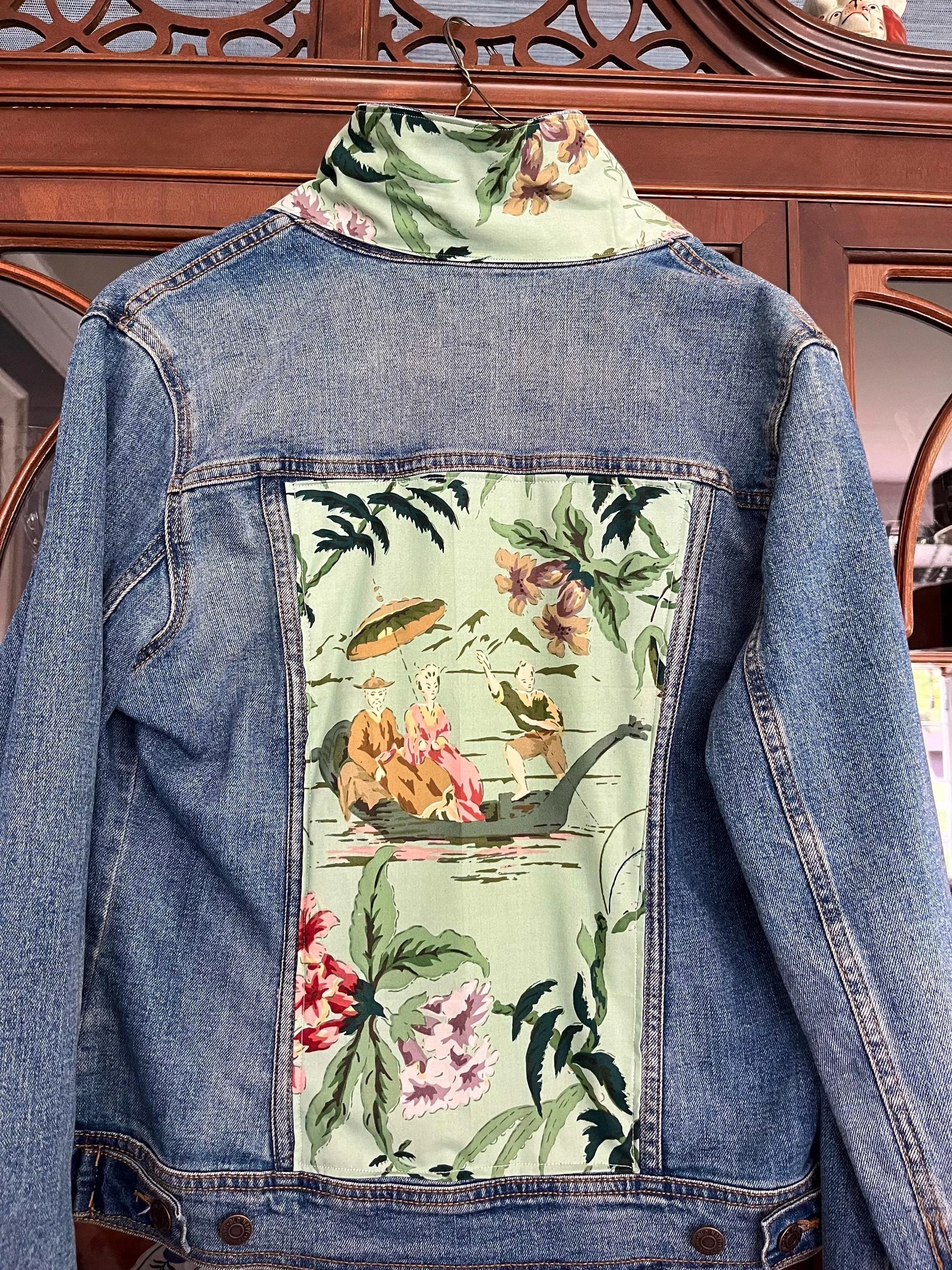 The Biffie! A classic denim jacket embellished with very rare Schumacher Yangtze aqua Asian fabric combines a casual silhouette with vibrant, sophisticated, eye-catching details. This jacket is one of a kind in size medium. Perfect for layering in transitional weather or inside when the air conditioning is on high. The rare striking Schumacher fabric embellishments add a unique and elegant flair, making it a standout piece in any wardrobe. Whether styled with a simple tee and jeans or a dress, this jacket brings an elegant stylish touch to any outfit.