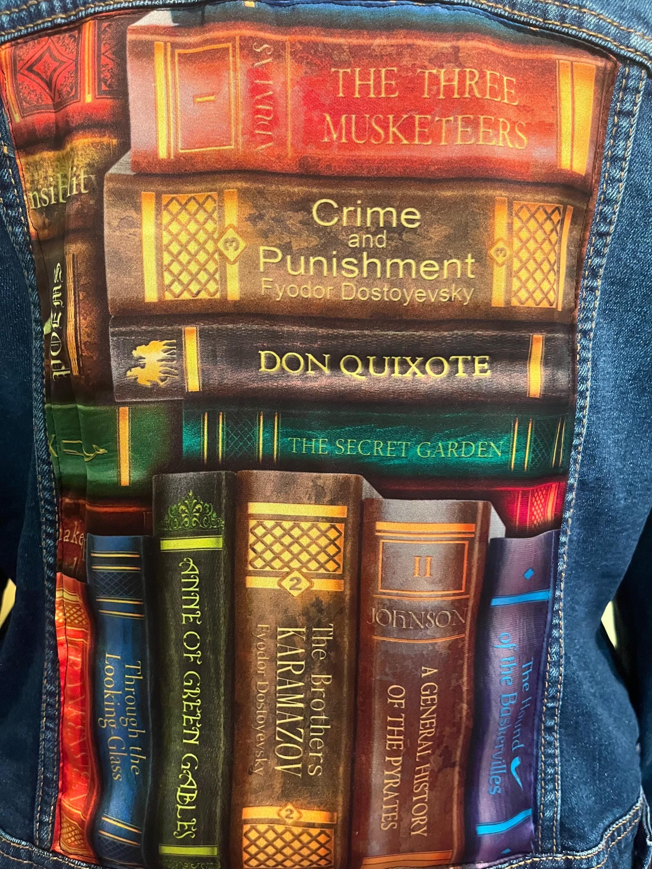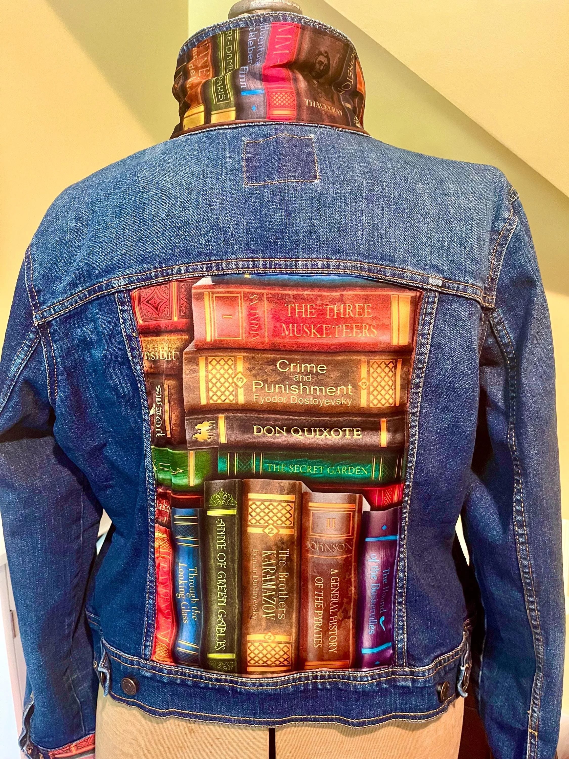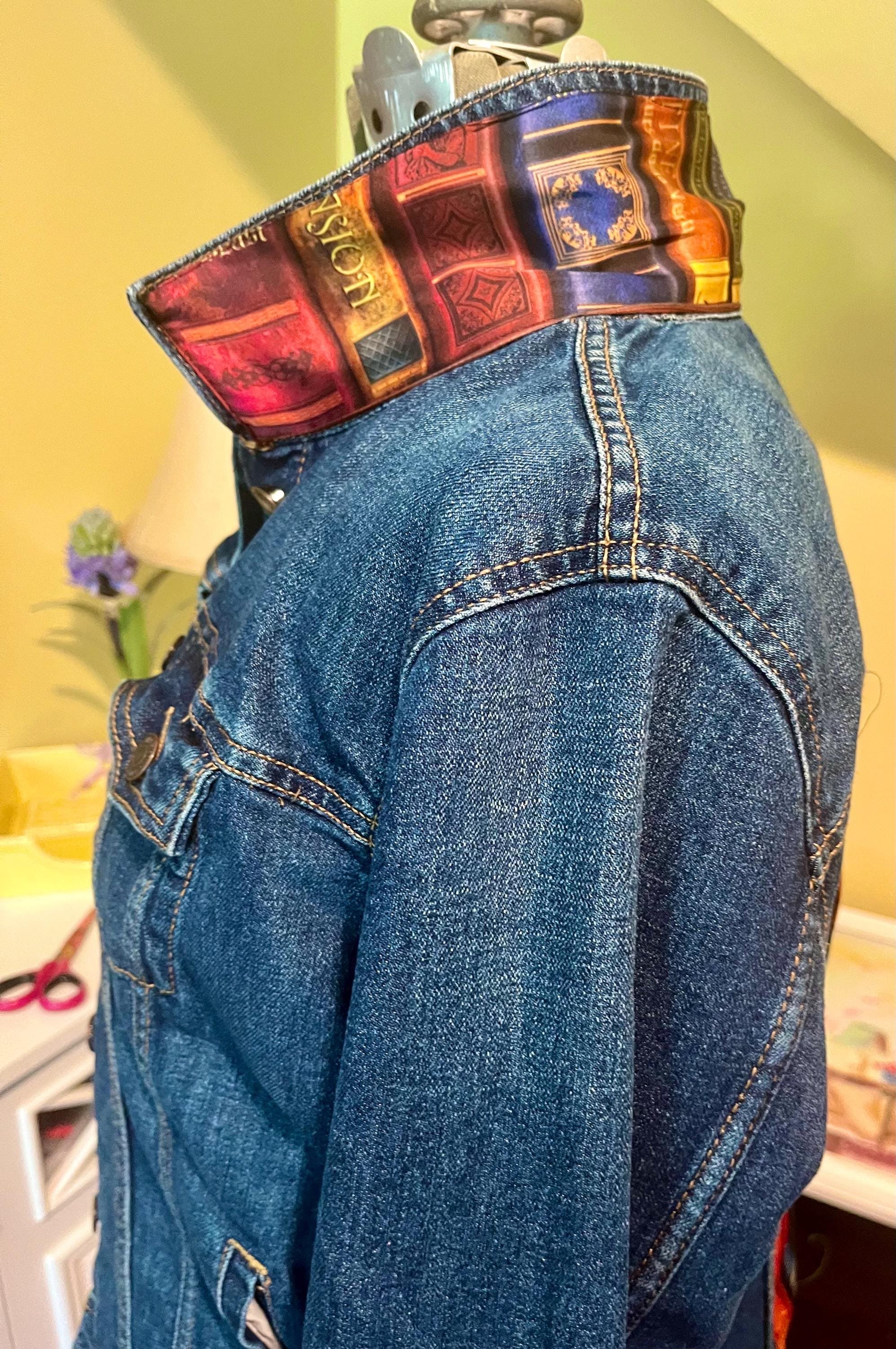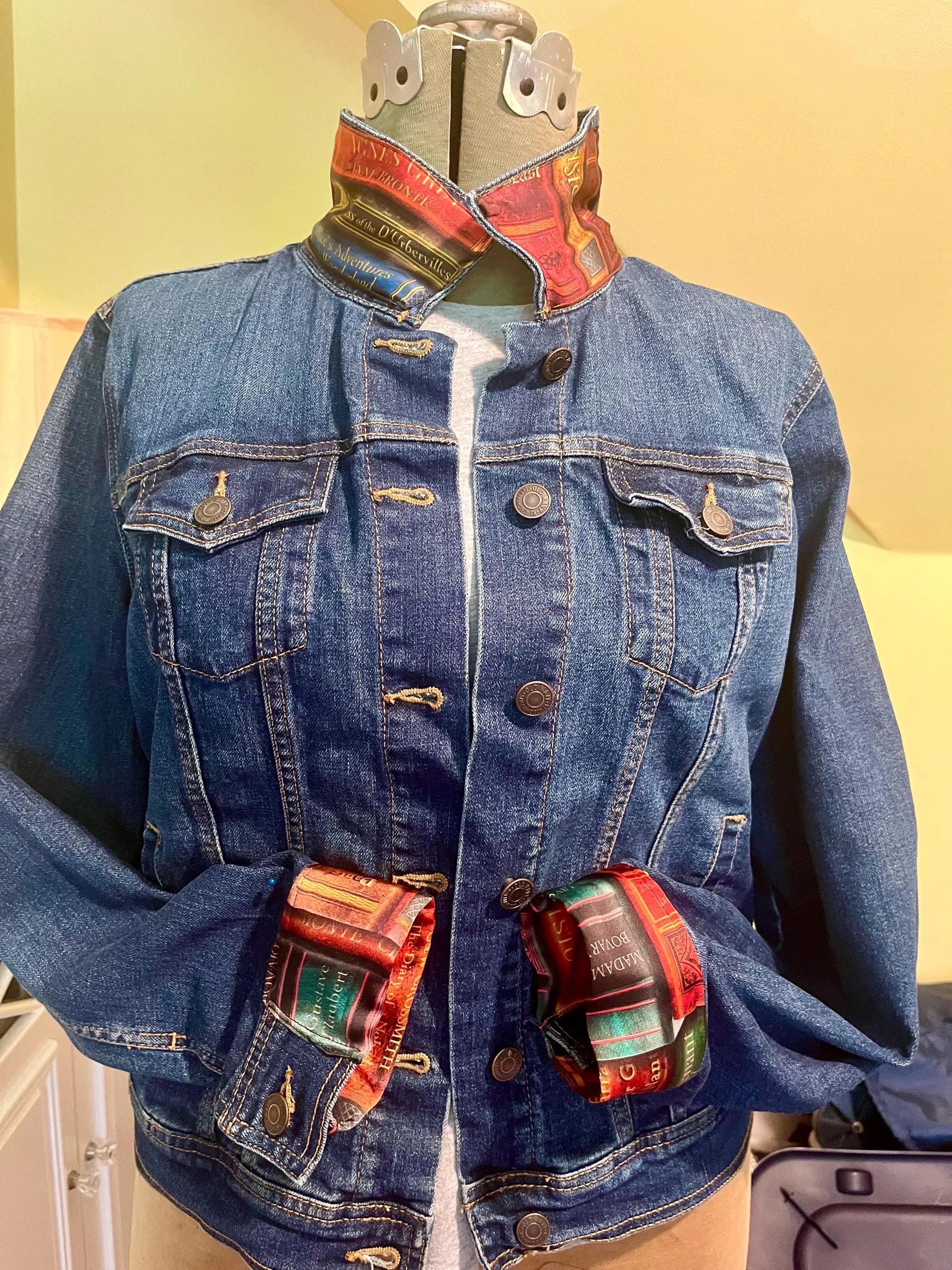 Attention Bibliophiles! A classic denim jacket adorned with a fabulous silk book scarf boasting classic novels creates a vibrant, sophisticated look that blends casual style with artistic flair. This jacket is perfect for any book lover, book club member, librarian…. It showcases creativity and individuality- Whether styled with a simple tee and jeans or a dress, this jacket brings elegant stylish touch to any outfit. This can be ordered in any size but this one is a large.