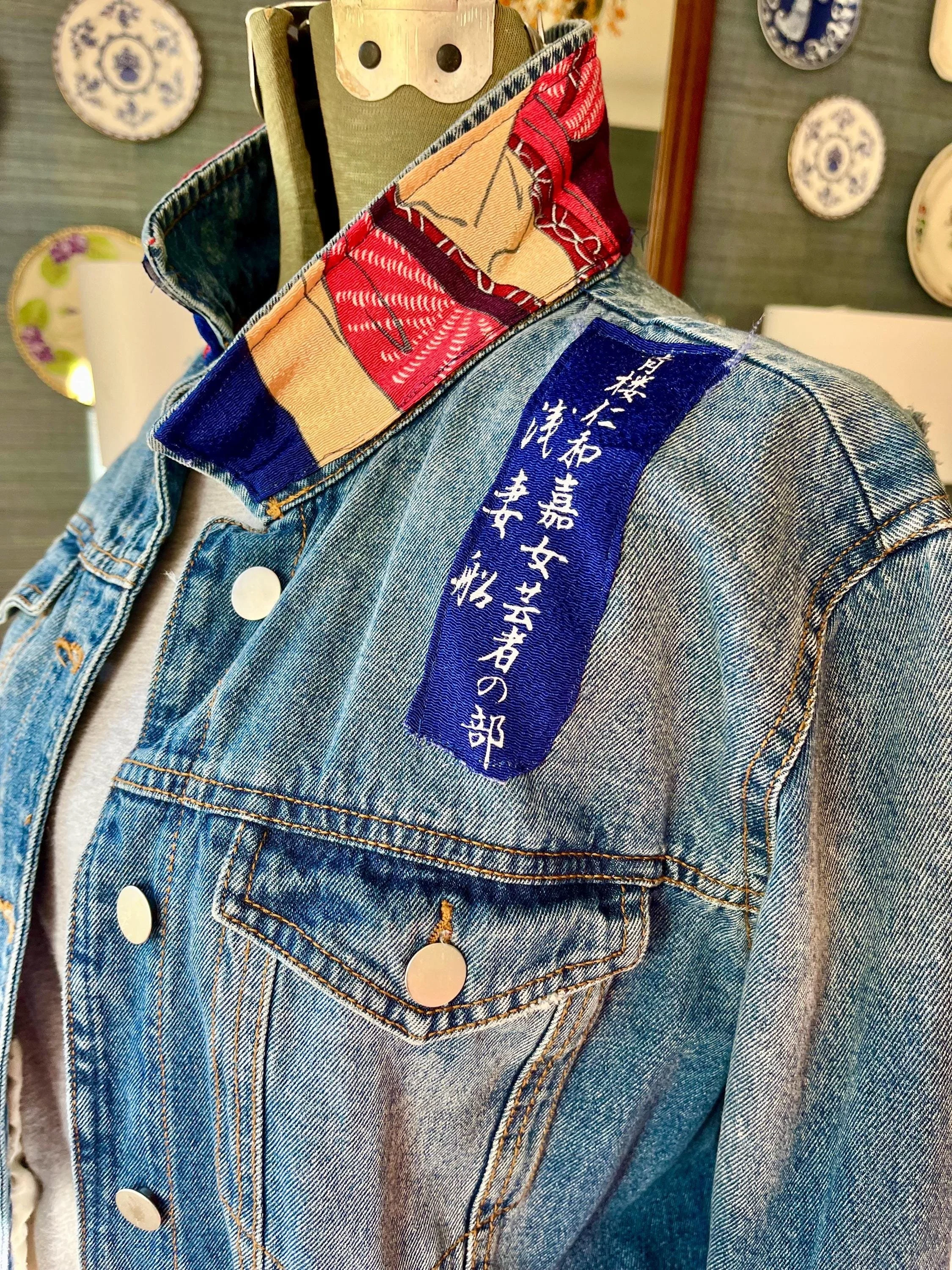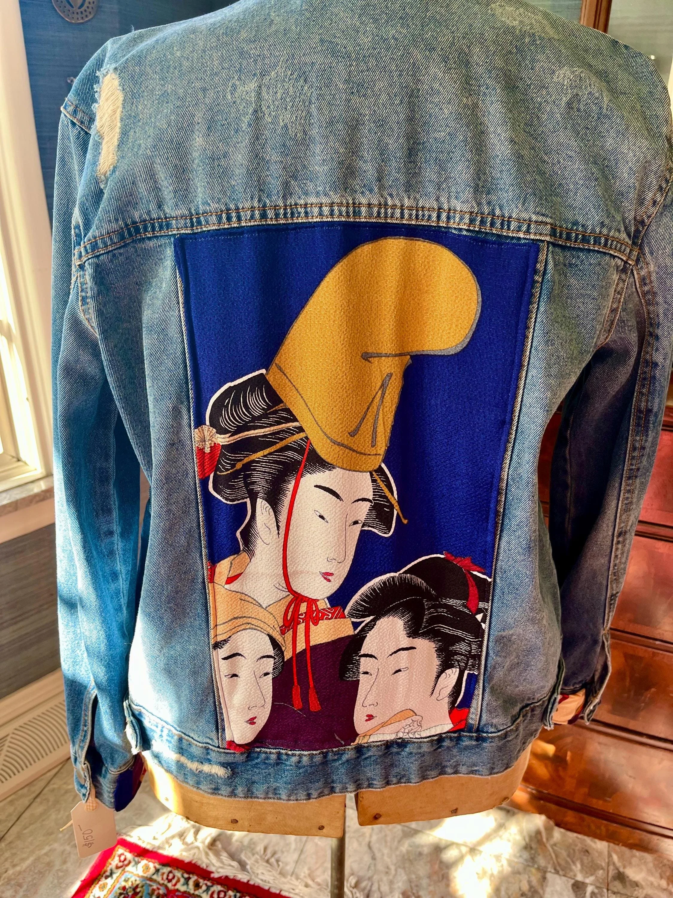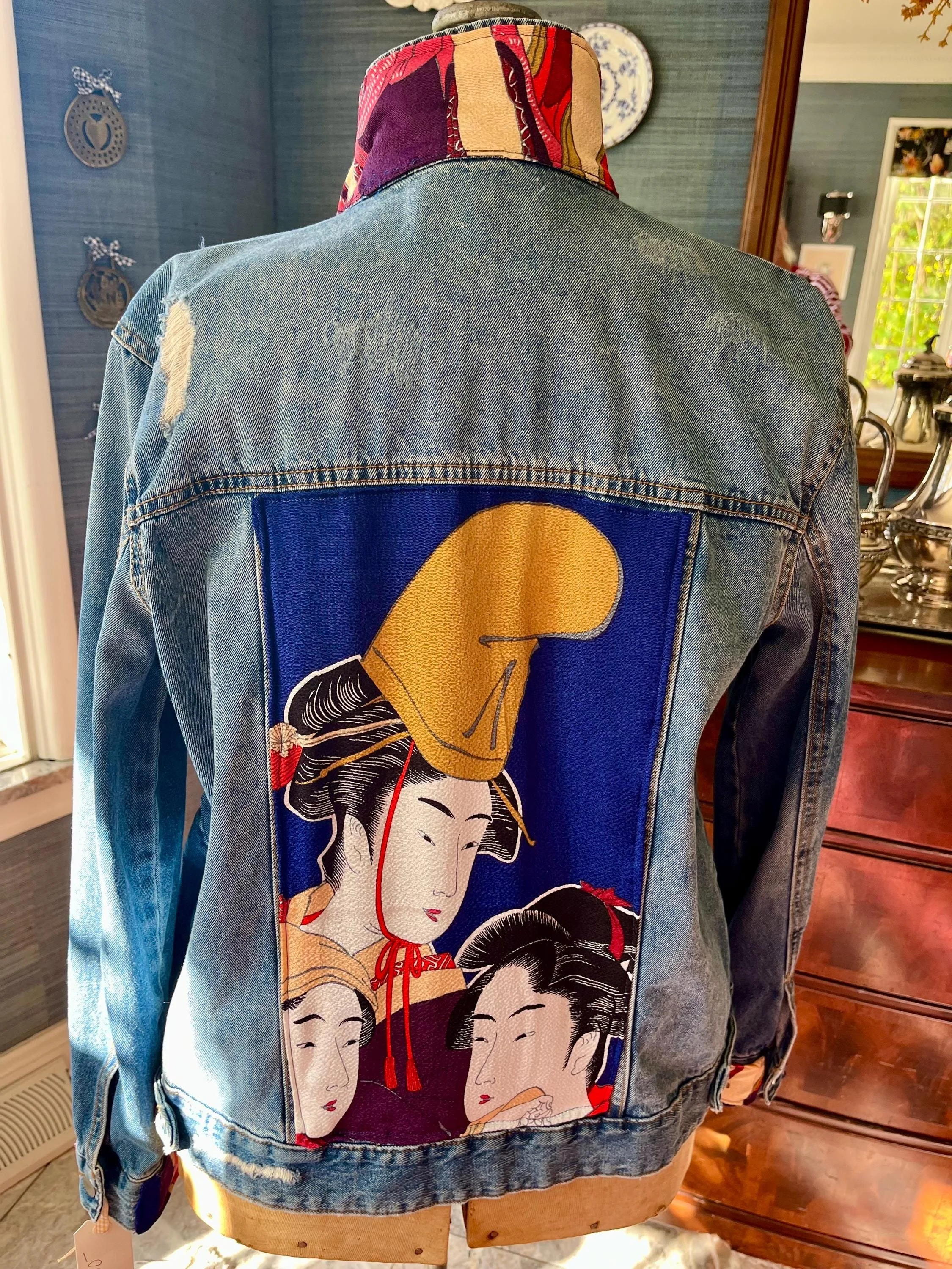 The Lily! A very large size medium (listed as an xl due to size) denim jean jacket is a stunning one-of-a-kind creation, showcasing a vintage designer silk crepe scarf featuring a Geisha, along with vibrant Asian-themed embellishments on the back, front, collar, and pocket. This unique piece is a fusion of classic, edgy, and culture. It’s a standout addition to any wardrobe.
