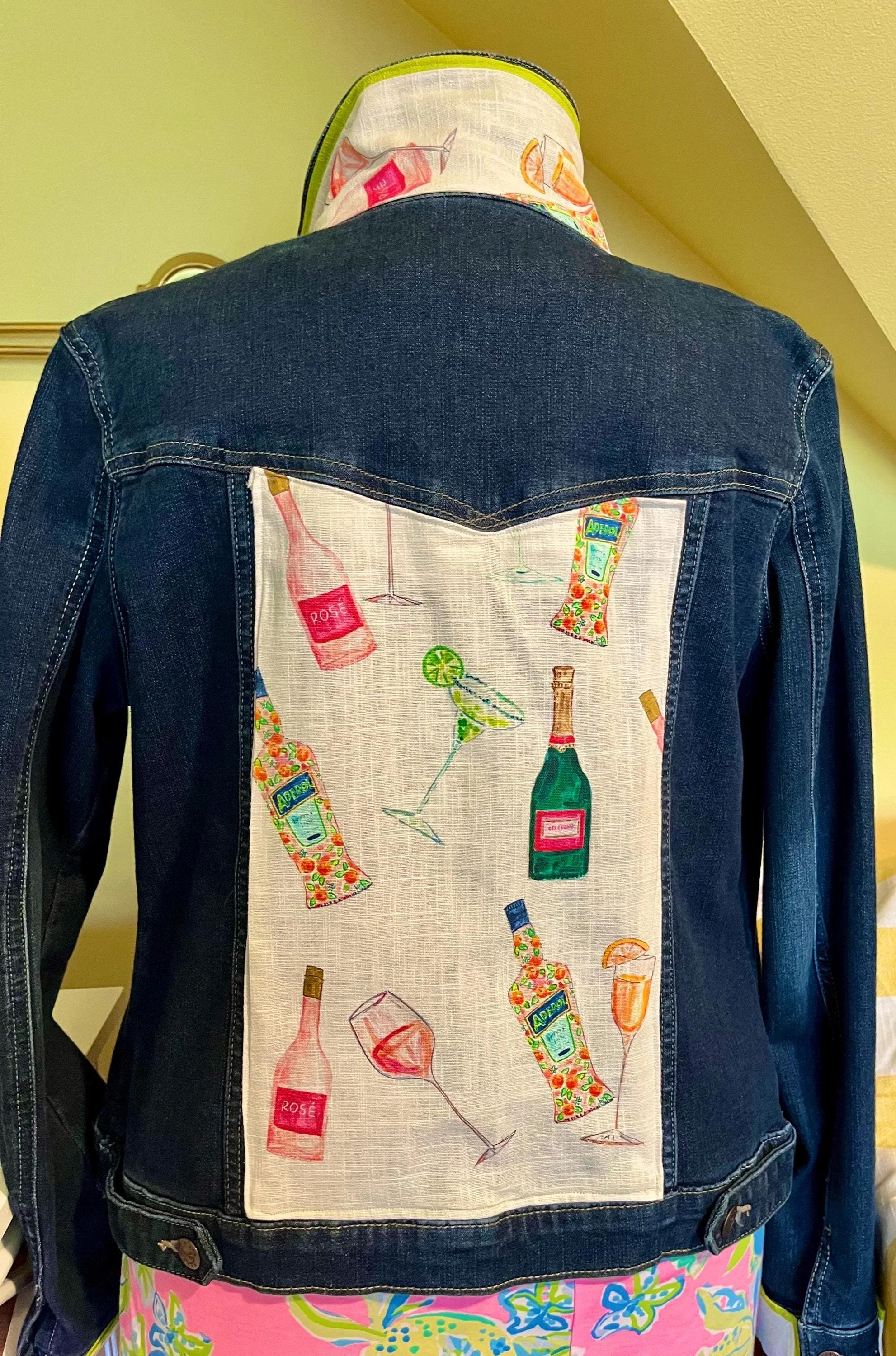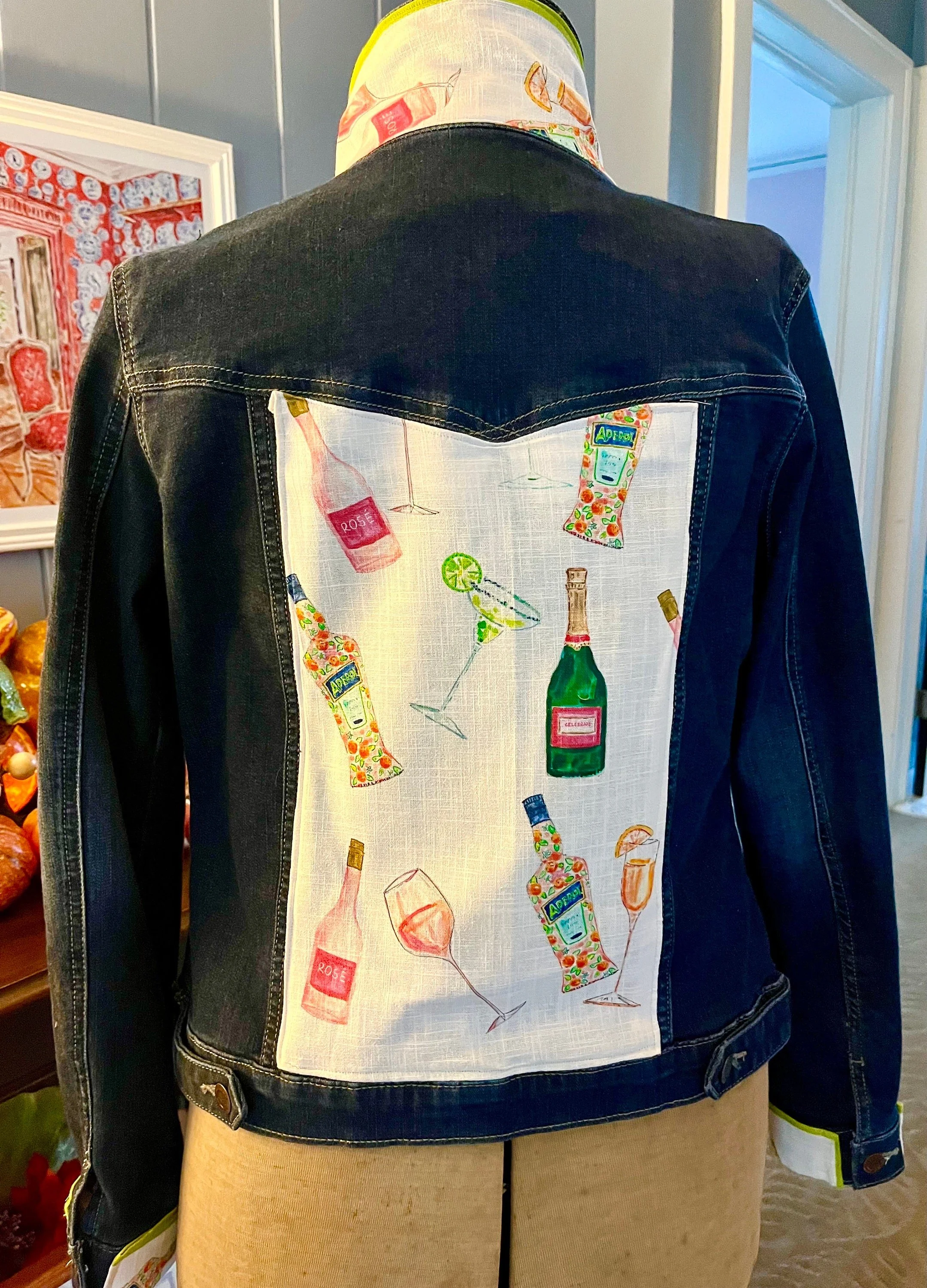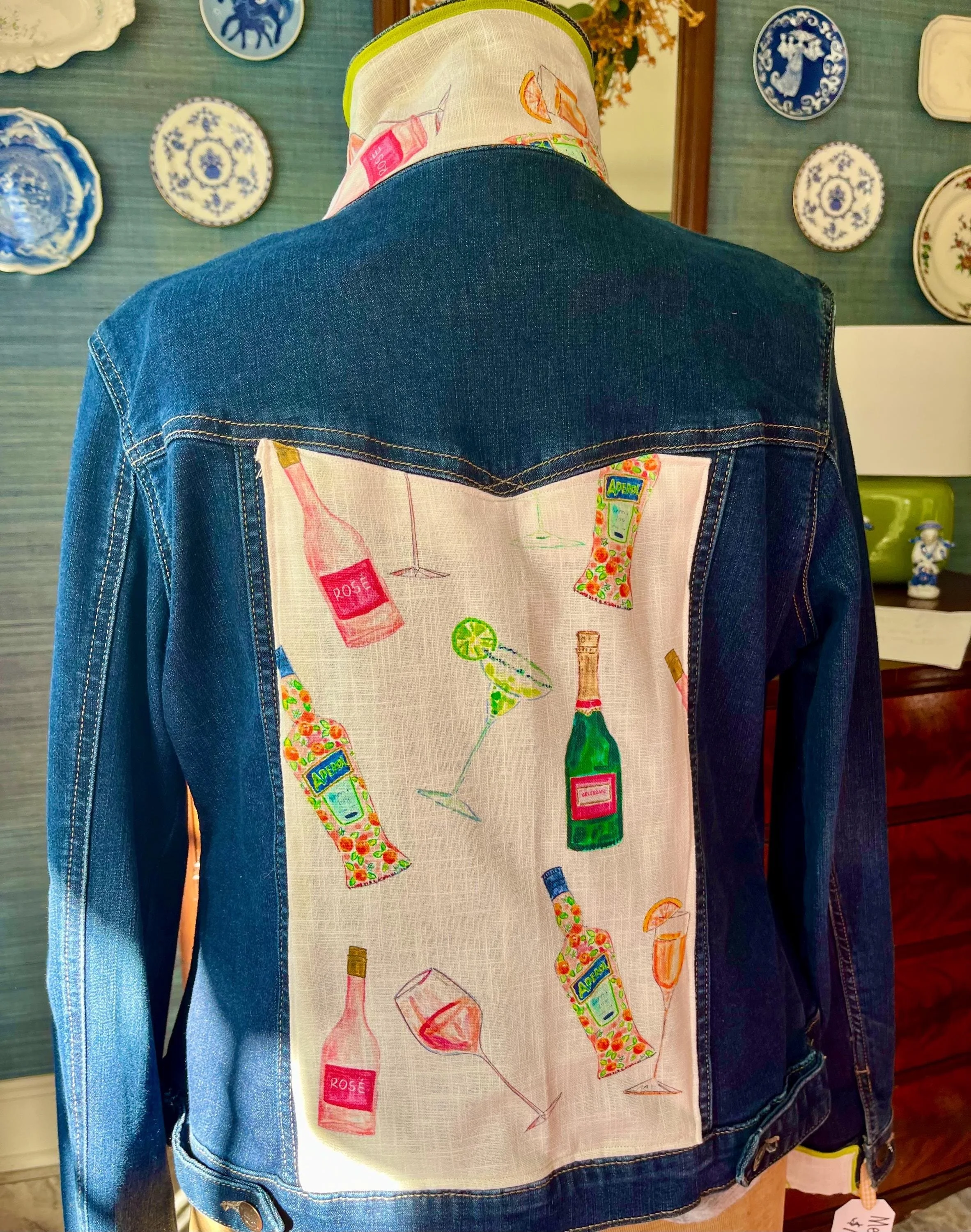 A classic denim jacket embellished with Aperol Spritz linen fabric makes a fun and trendy statement piece for any celebration! Decorated with Designer Evelyn Henson fabric, this jacket adds a pop of color and fun to any outfit. Fun! Colorful! Festive !