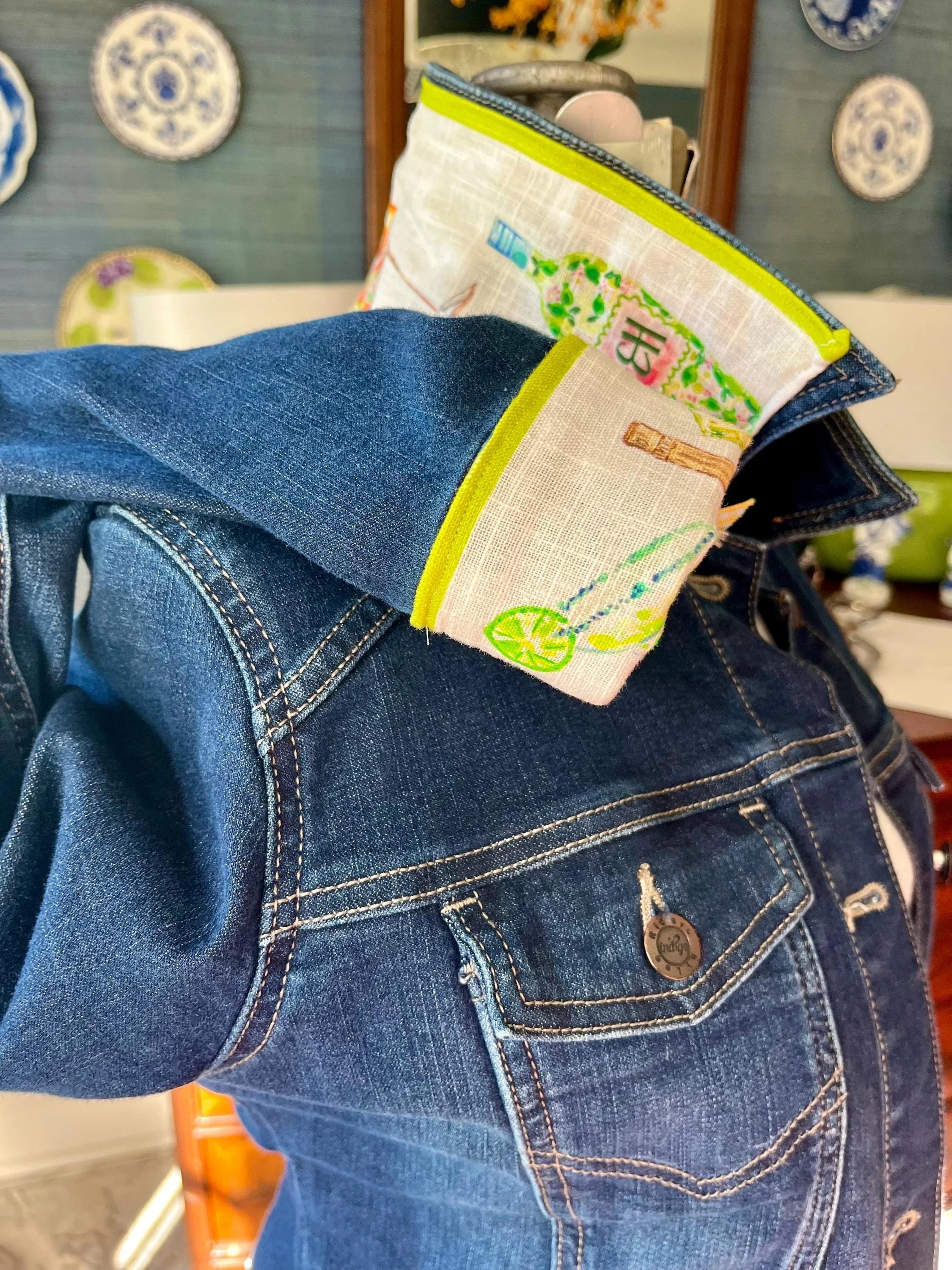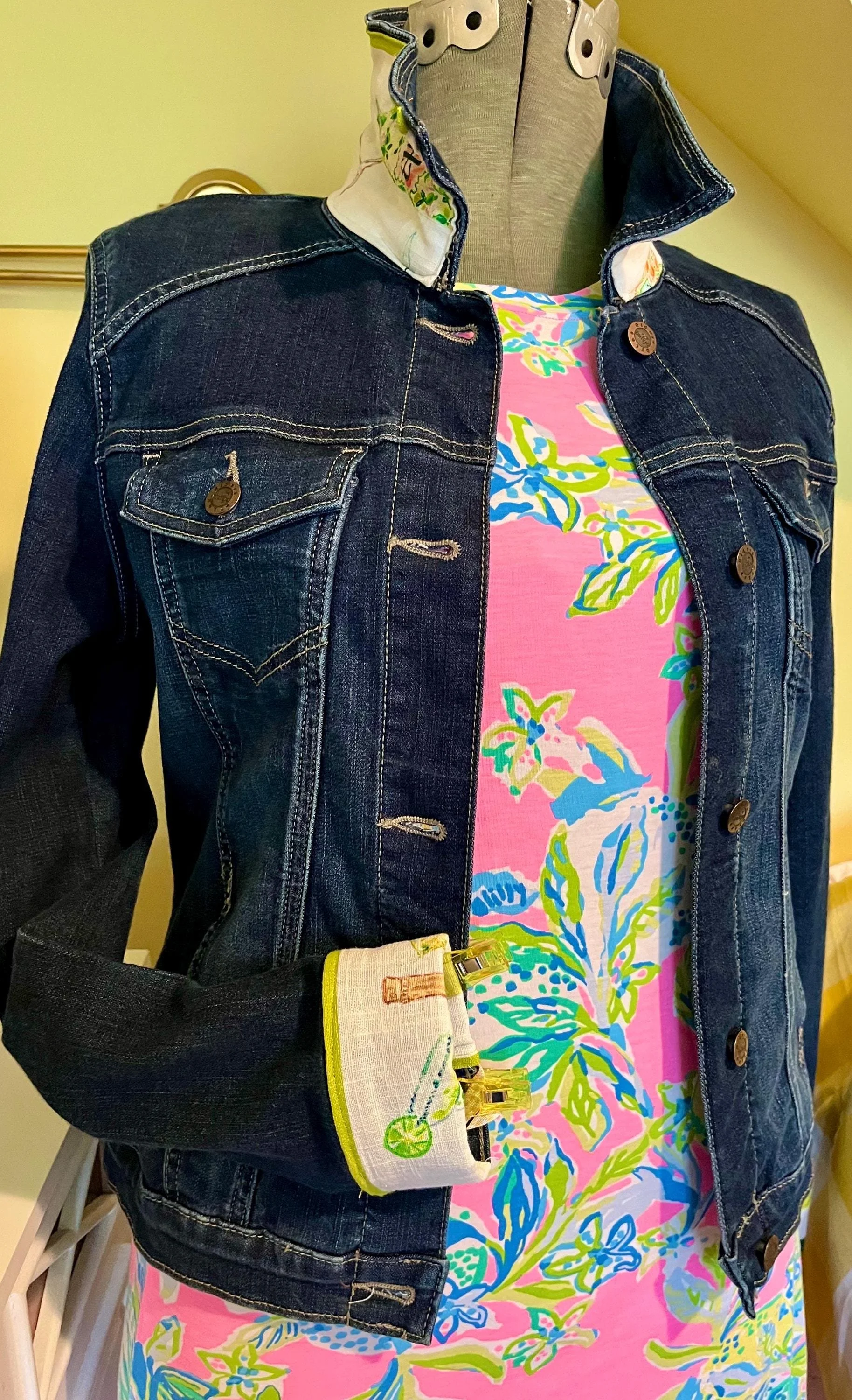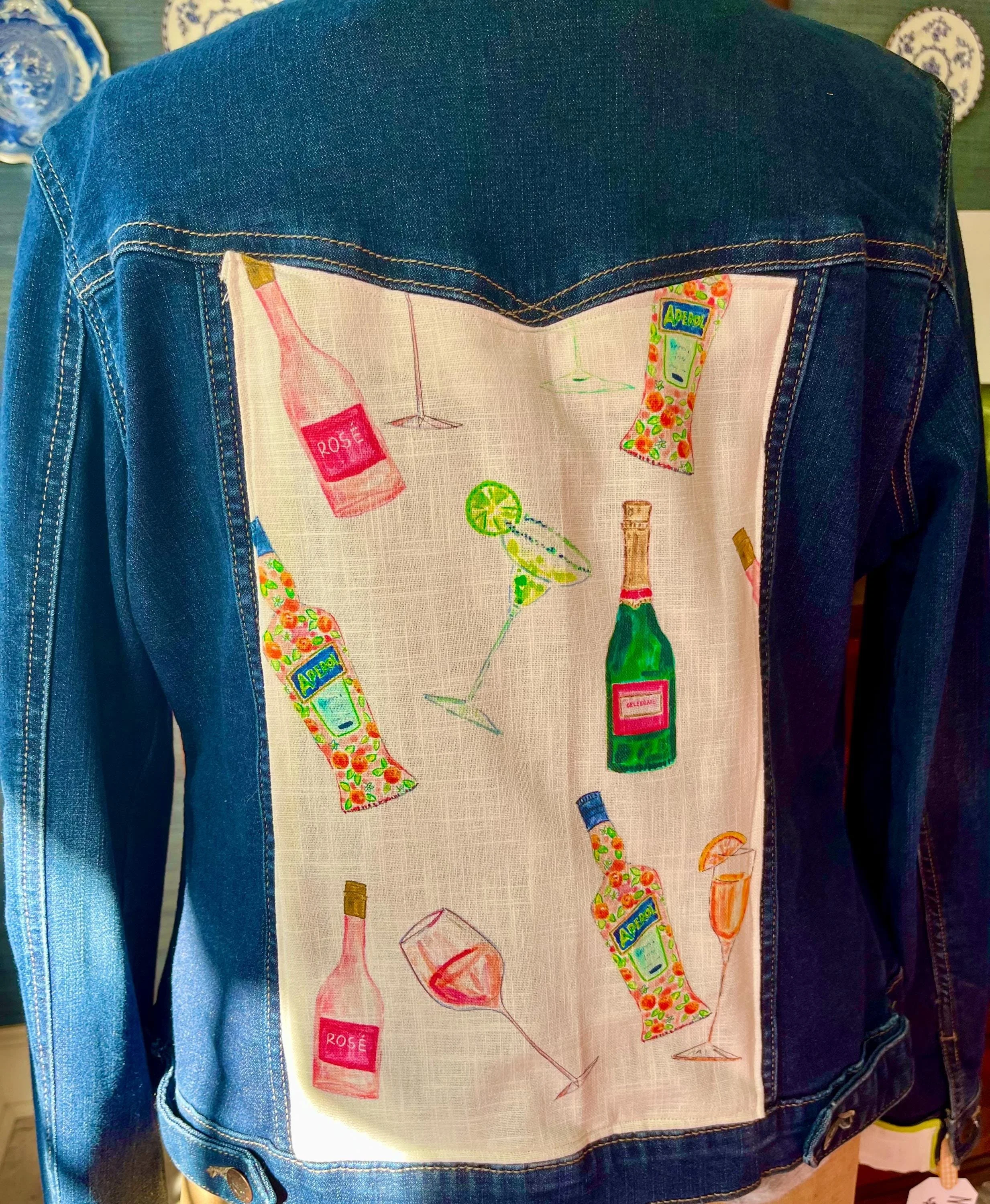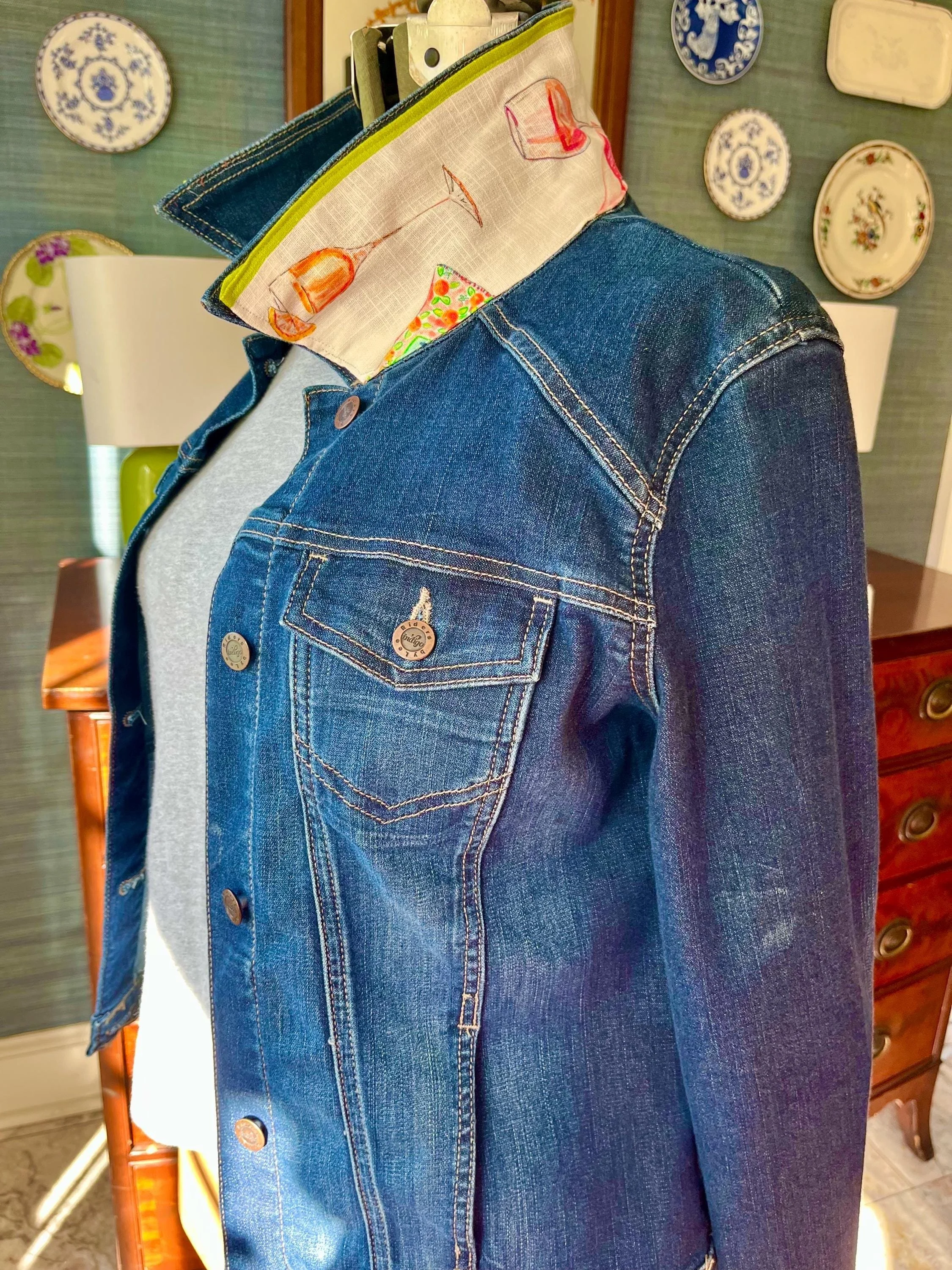 A classic denim jacket embellished with Aperol Spritz linen fabric makes a fun and trendy statement piece for any celebration! Decorated with Designer Evelyn Henson fabric, this jacket adds a pop of color and fun to any outfit. Fun! Colorful! Festive !