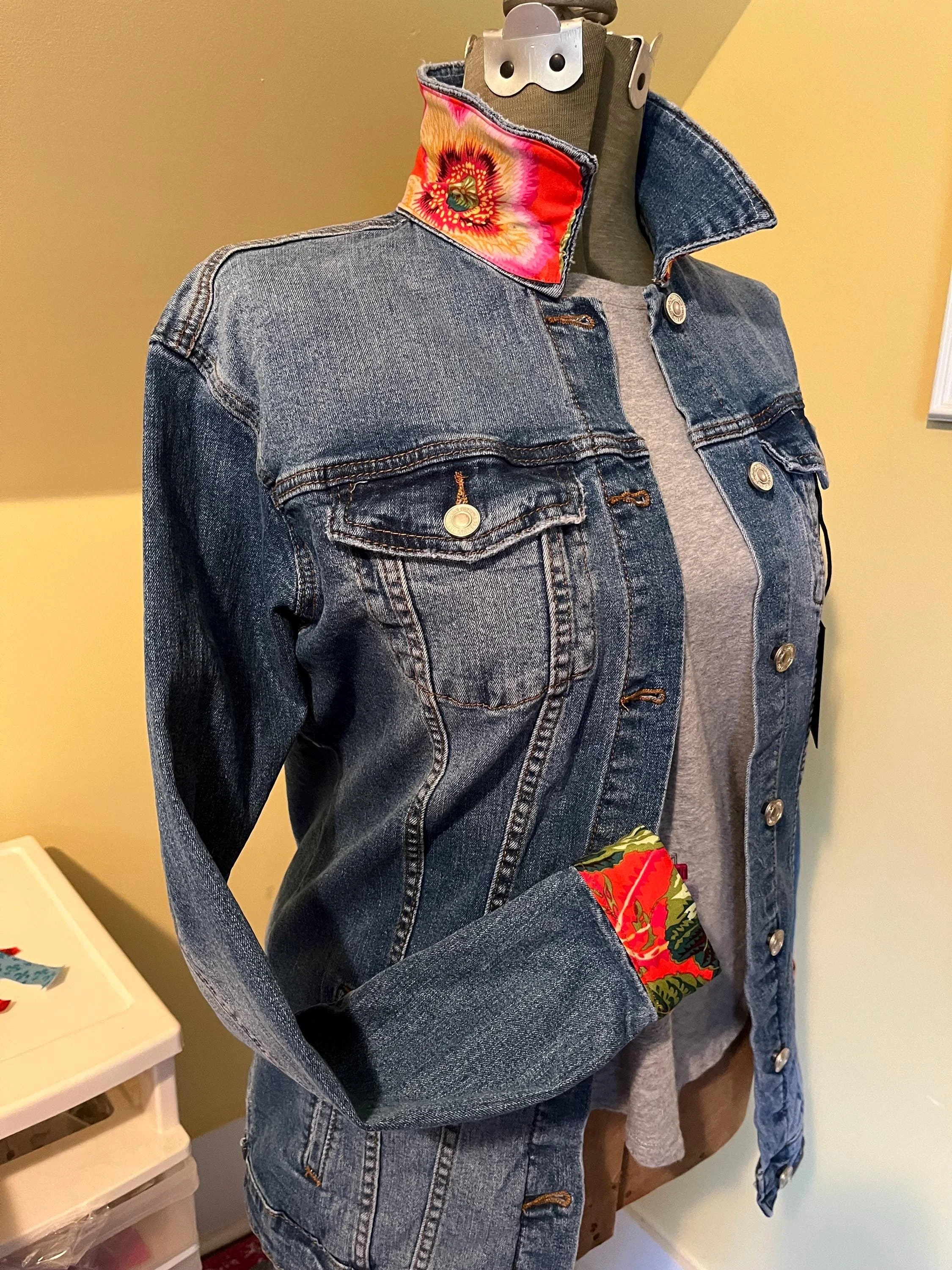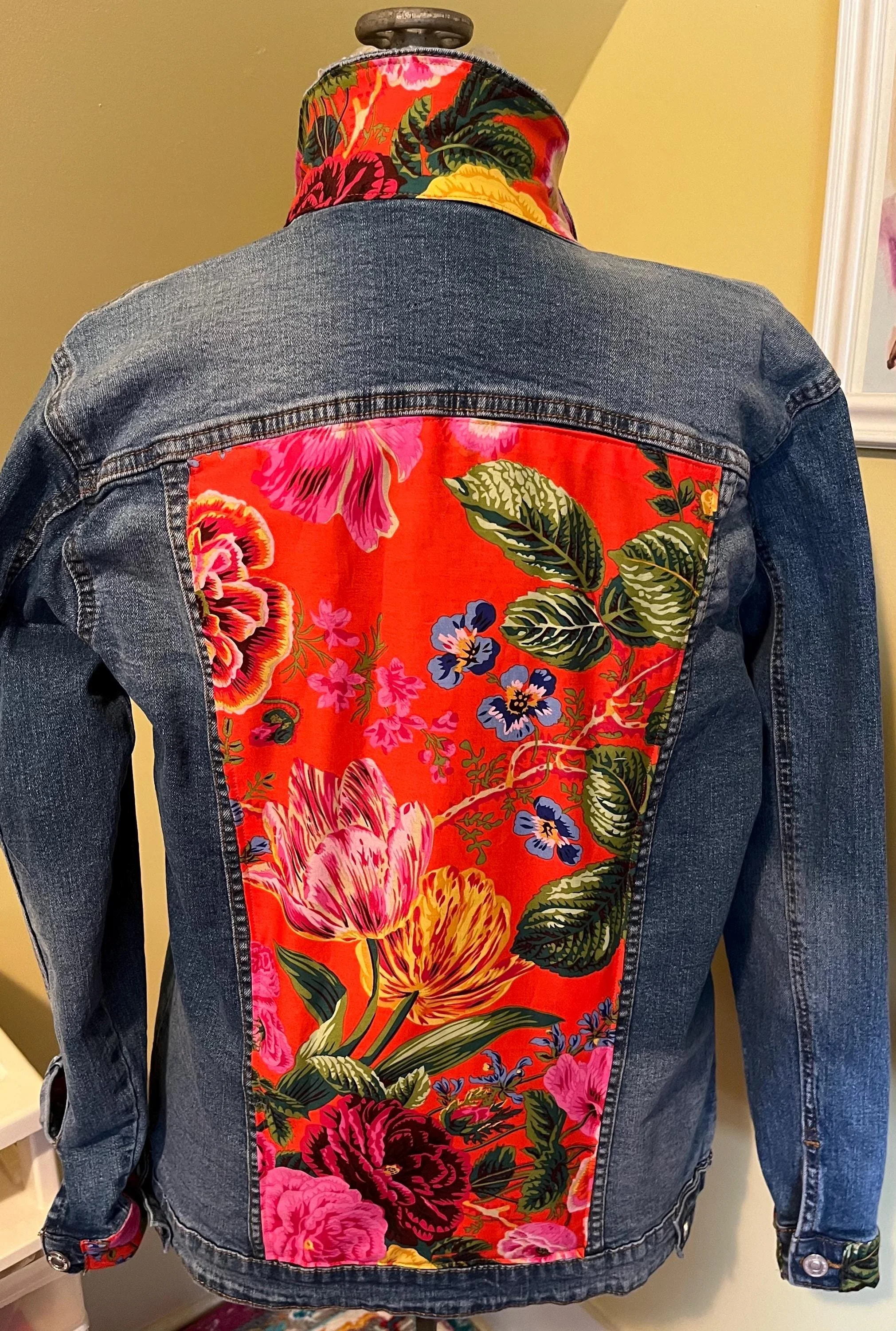 The Pippa! A classic denim jacket adorned with a fabulous floral fabric boasting vibrant and cheery colors that blends casual style with artistic flair. This jacket is perfect for any activity and blends with all colors. It showcases creativity and individuality- Whether styled with a simple tee and jeans or a dress, this jacket brings elegant stylish touch to any outfit. This can be ordered in any size.