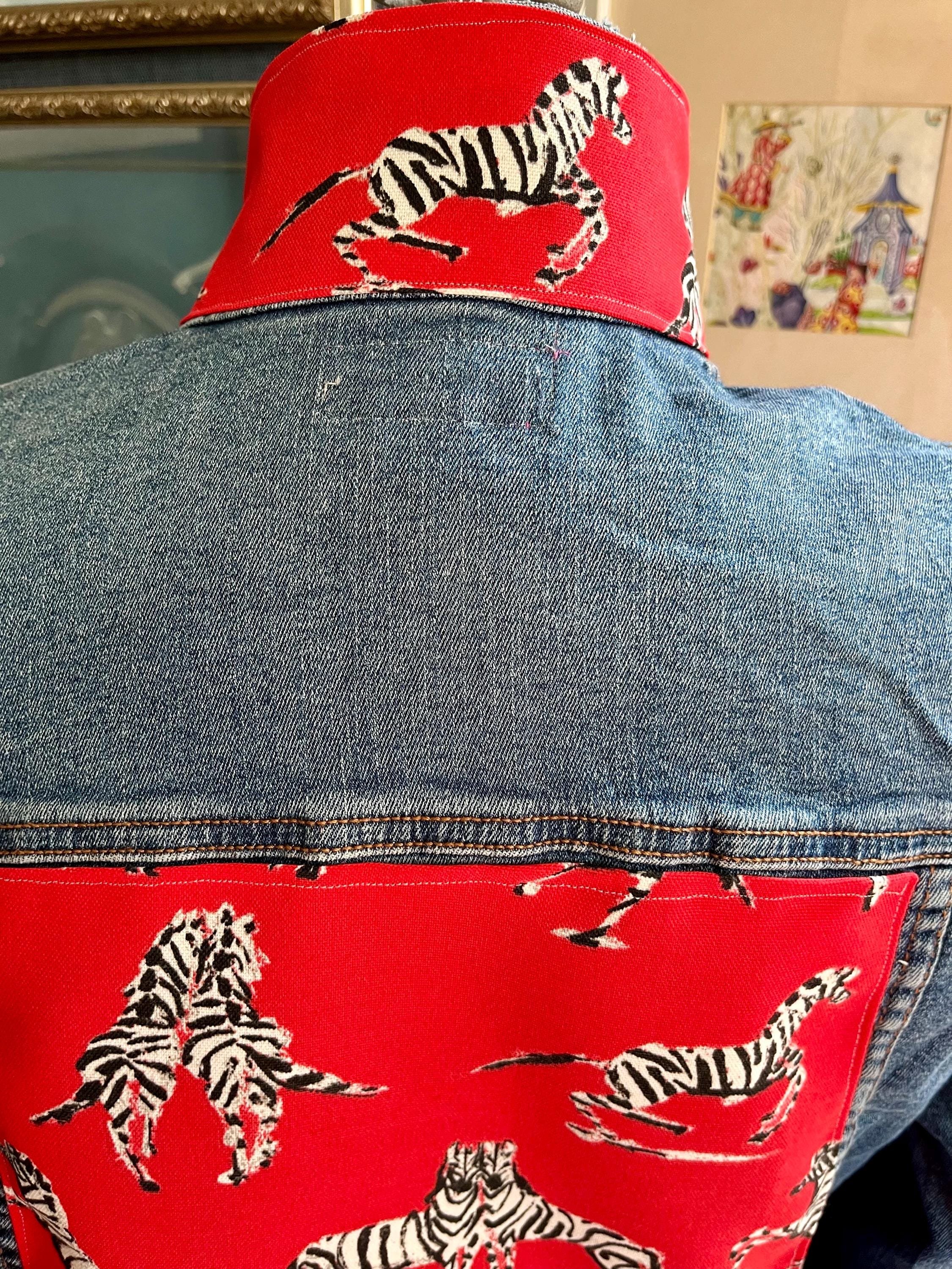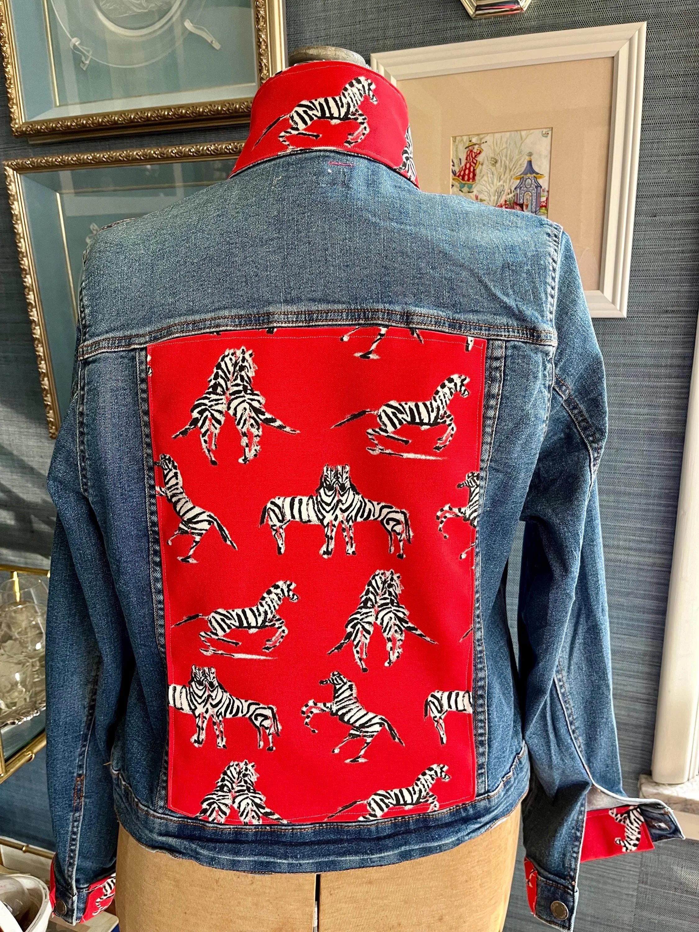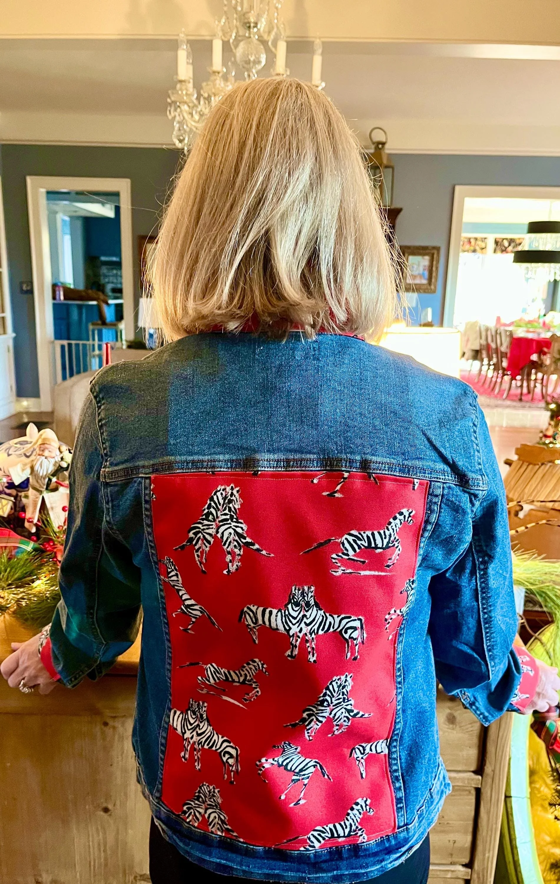 A bright Novogratz designer fabric with zebras embellishes a denim jacket creating a charming fusion of whimsy and classic style. This unique piece of fabulous fabric sewn onto the classic denim jacket is perfect for every day or for any gathering. It adds a quirky touch to everyday outfits and showcases individuality and a love for fun, making it a delightful statement piece for any wardrobe.