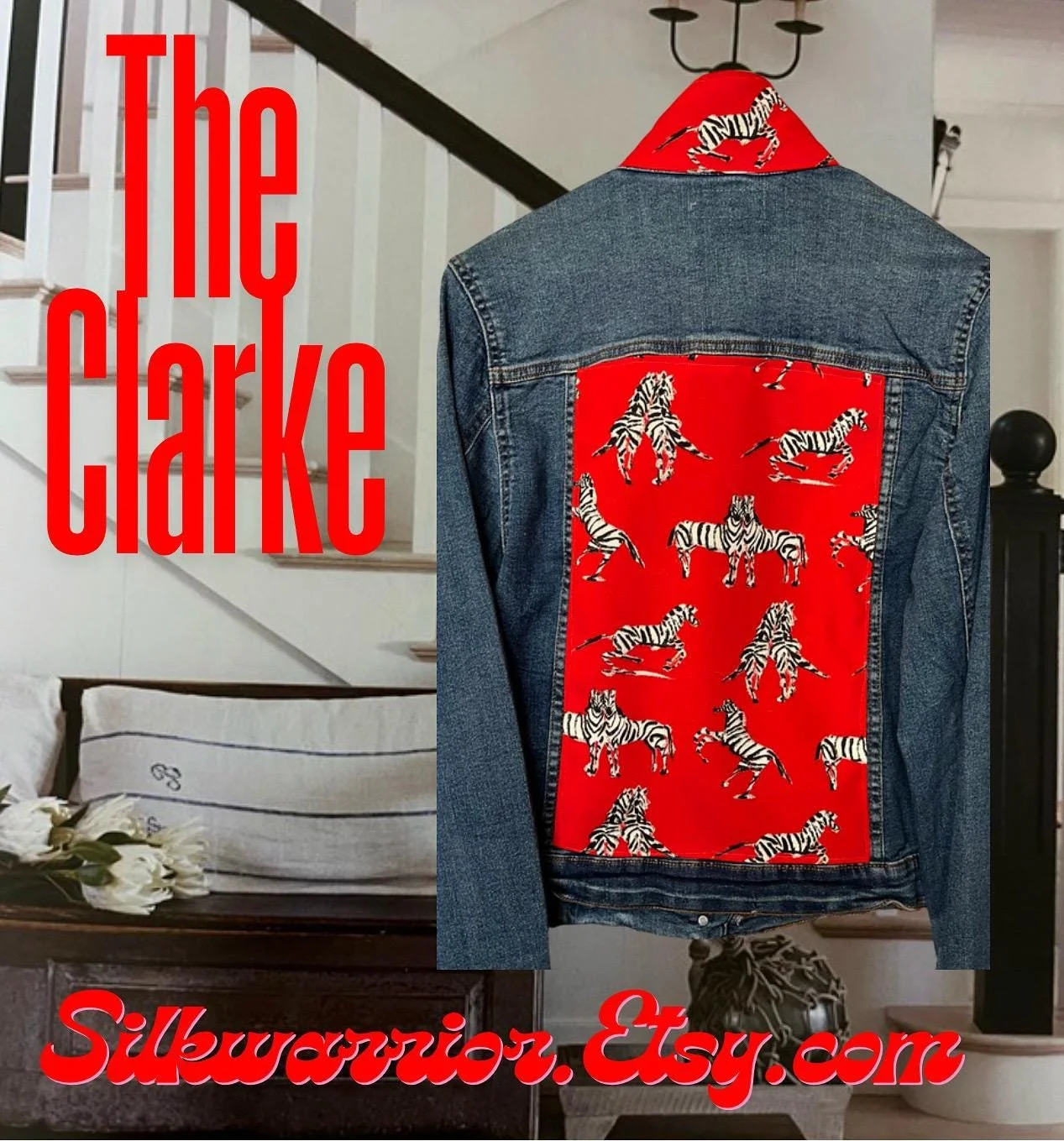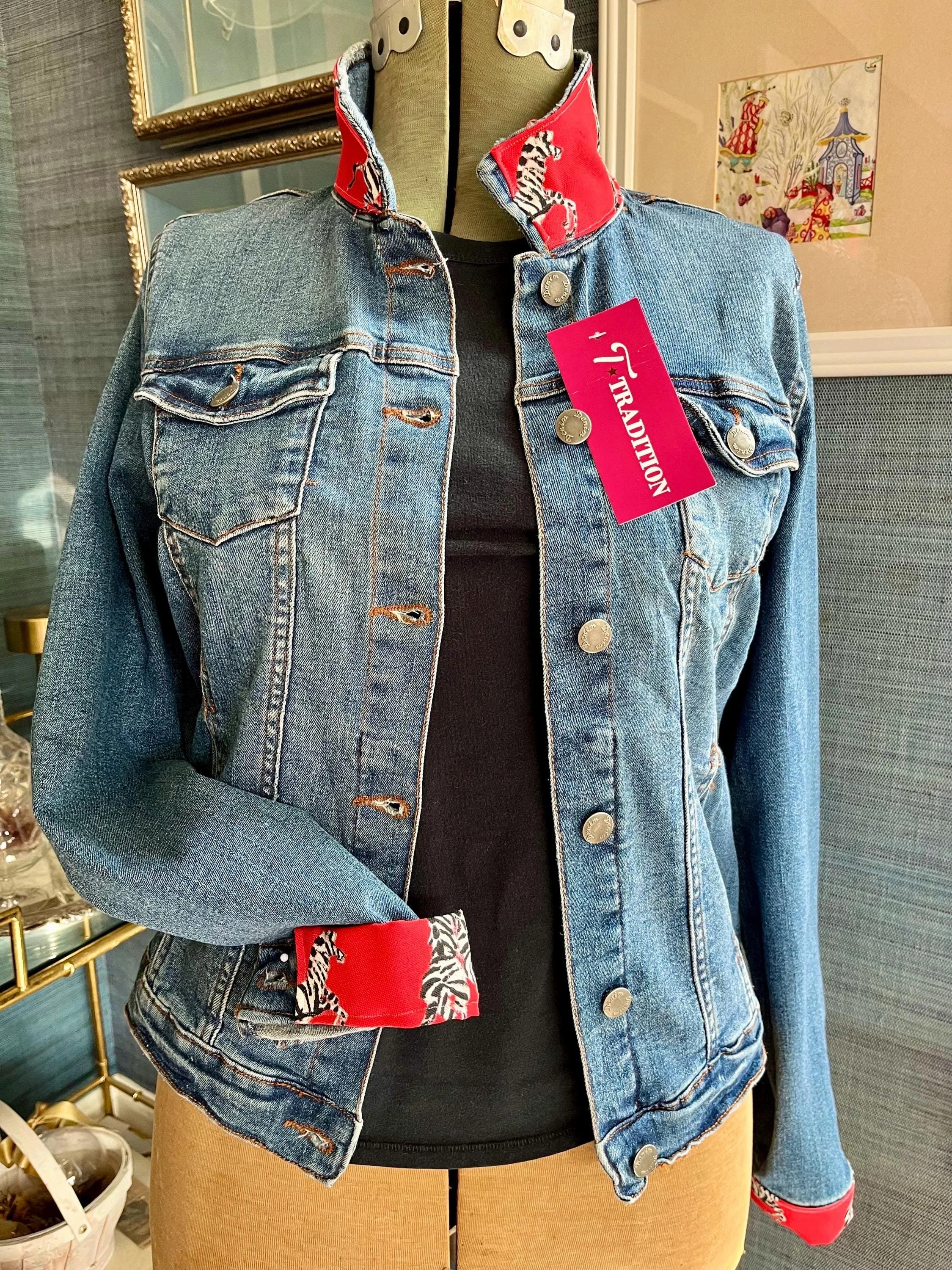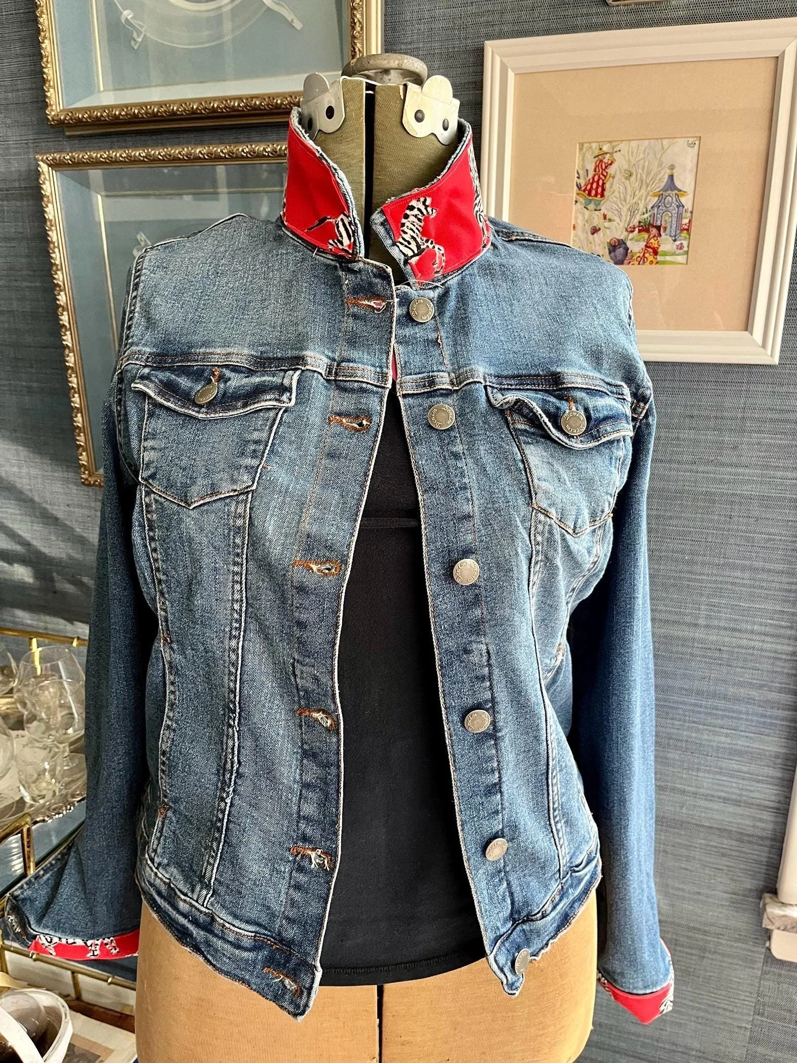 A bright Novogratz designer fabric with zebras embellishes a denim jacket creating a charming fusion of whimsy and classic style. This unique piece of fabulous fabric sewn onto the classic denim jacket is perfect for every day or for any gathering. It adds a quirky touch to everyday outfits and showcases individuality and a love for fun, making it a delightful statement piece for any wardrobe.