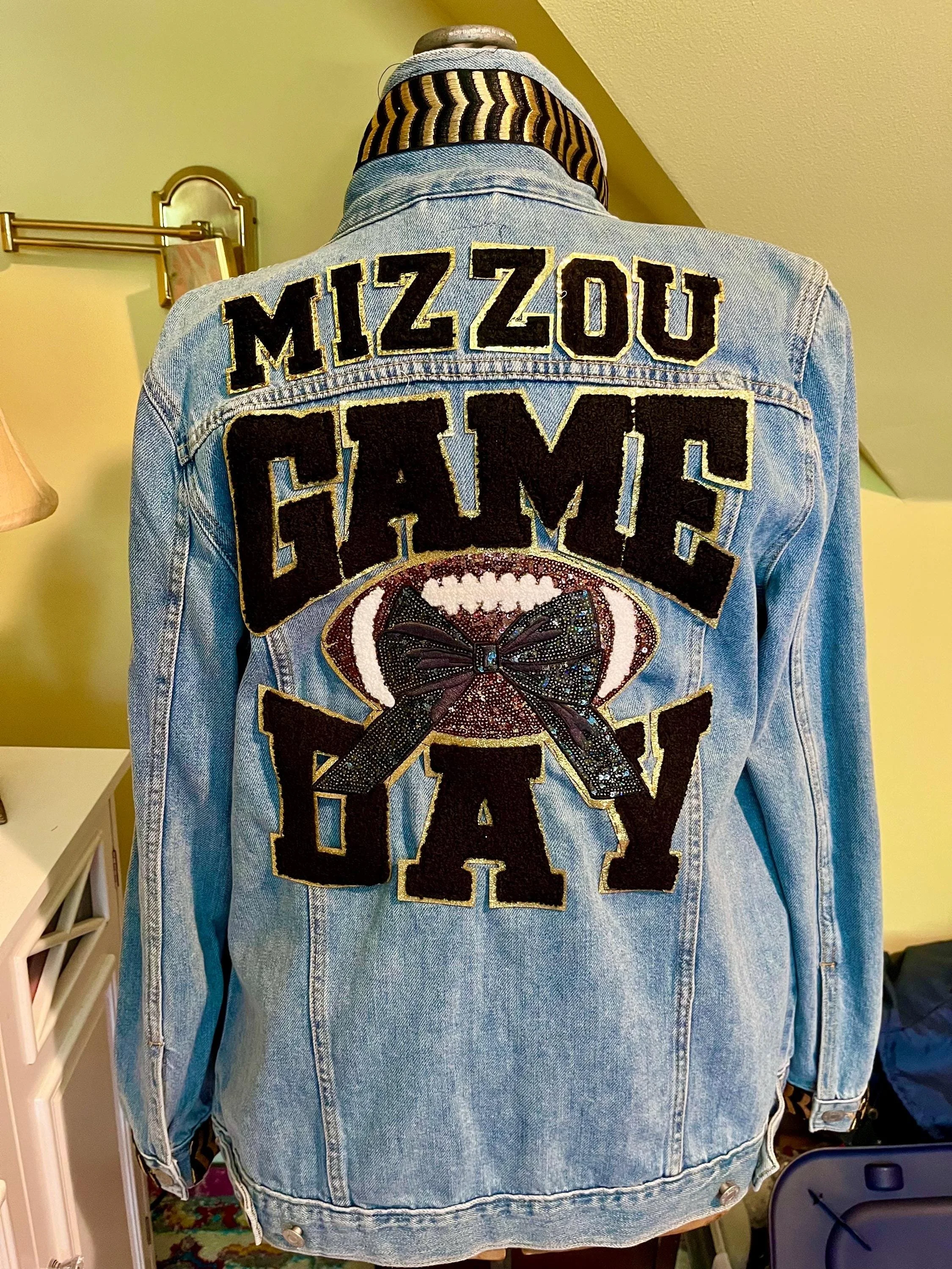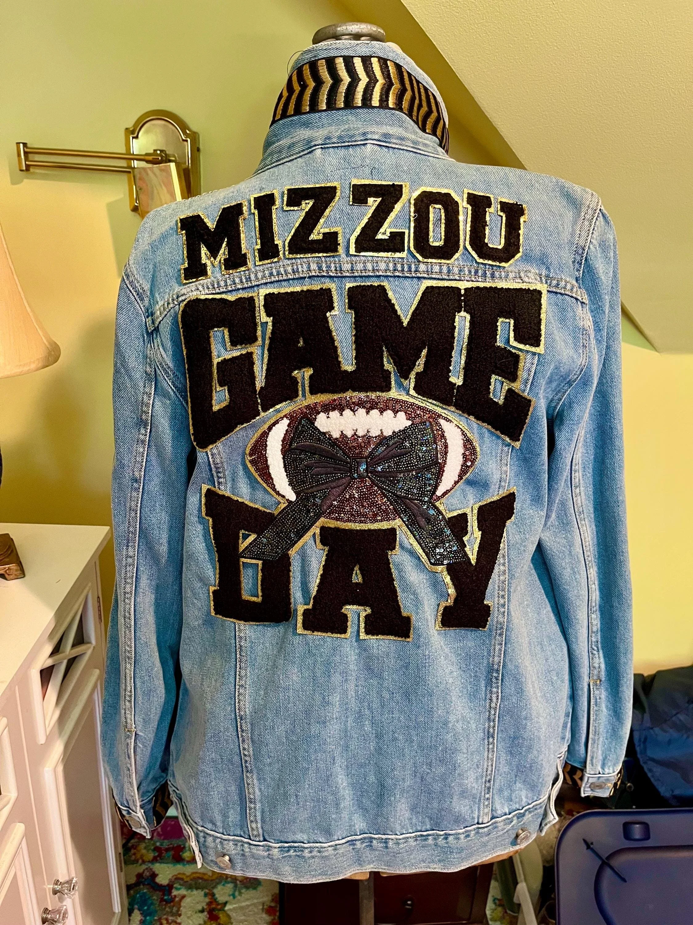 MIZZOU Game Day! The combination of a classic denim jacket, a black and gold Game Day applique, MIZZOU, and elegant trim creates a team spirit jacket that is a must have for Tiger fans! What a unique and original way to show your support of MU! This is an men’s medium which is comparable to a ladies XL but pre - order is available for any team Game Day jacket in any color or in any size with a maximum of 4 weeks creation time.