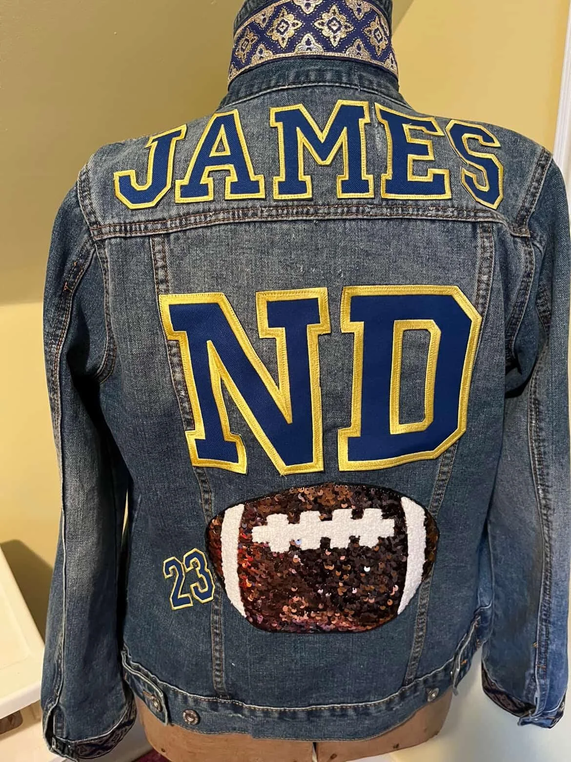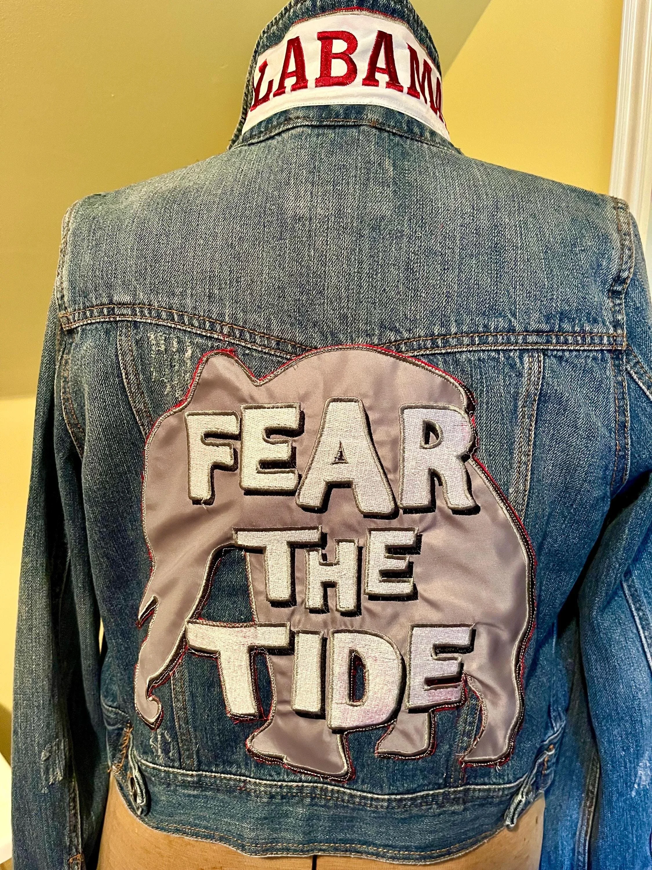 Fear the Tide Denim Jacket! Football is been alive and well in Alabama so why not show your spirit with an adorable Fear the Tide denim jacket. This jacket will embellished on the back, cuffs, and collar to create a fun and sporty way to share the love for Bama Football. It is available in any size denim jacket.