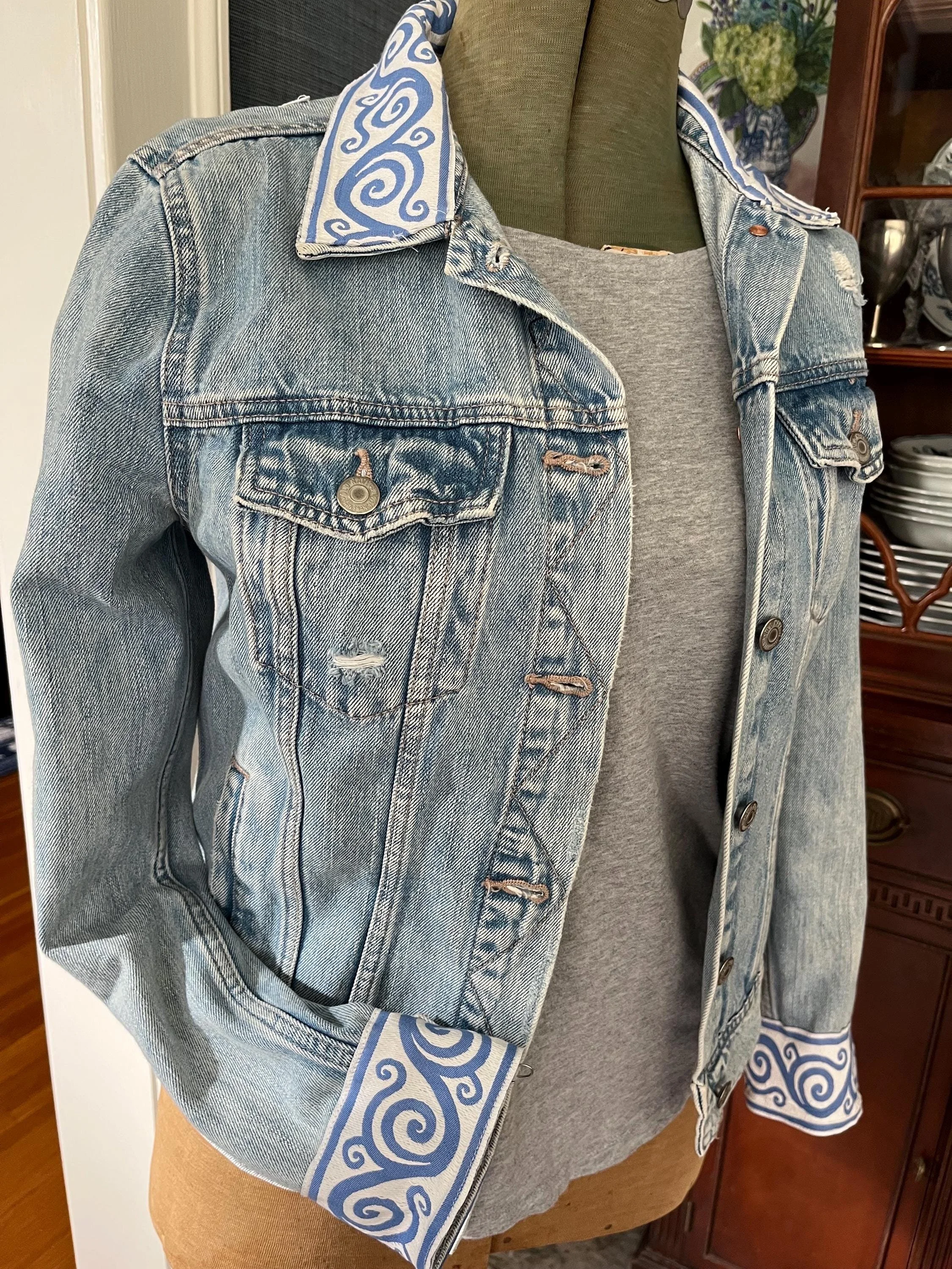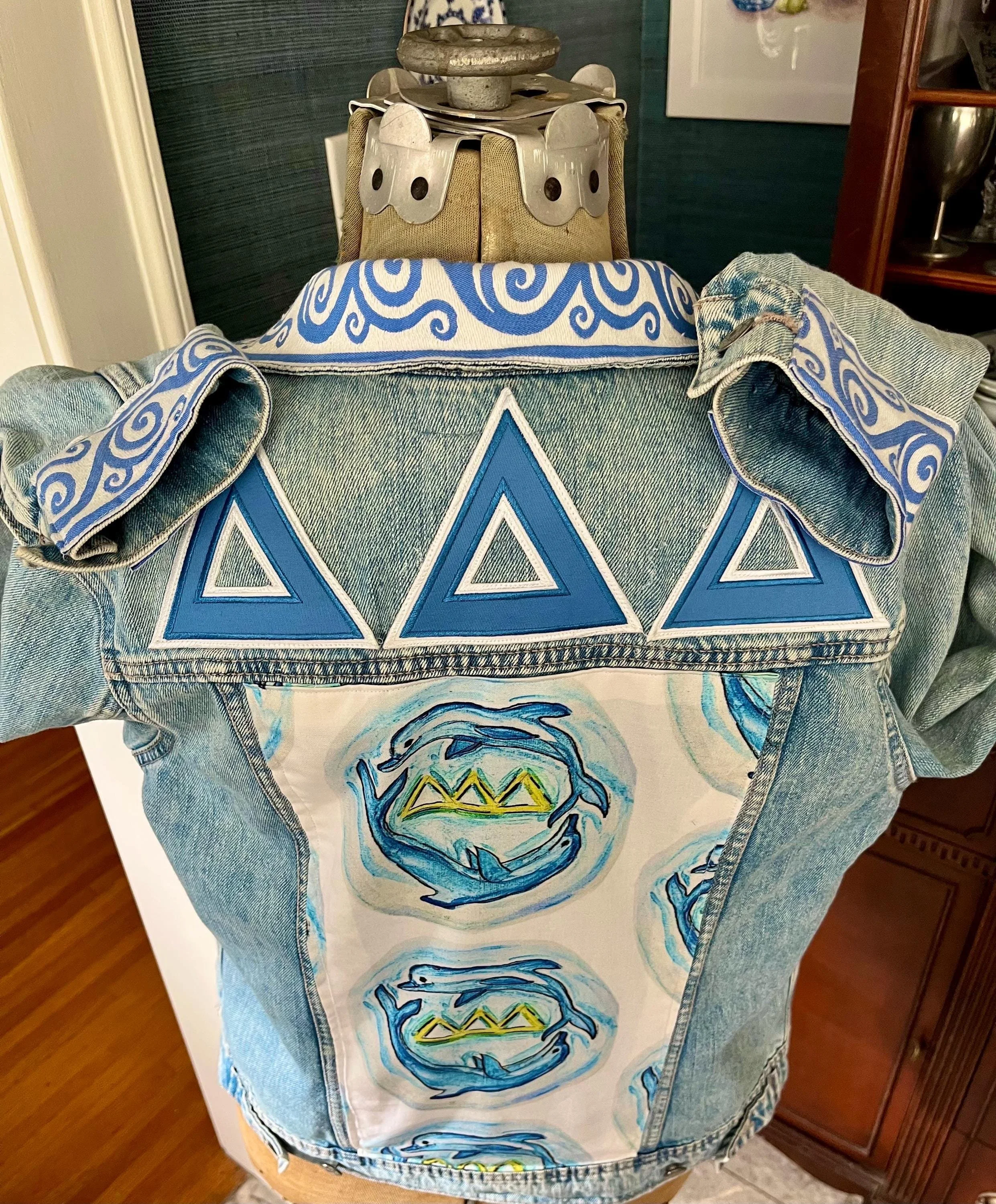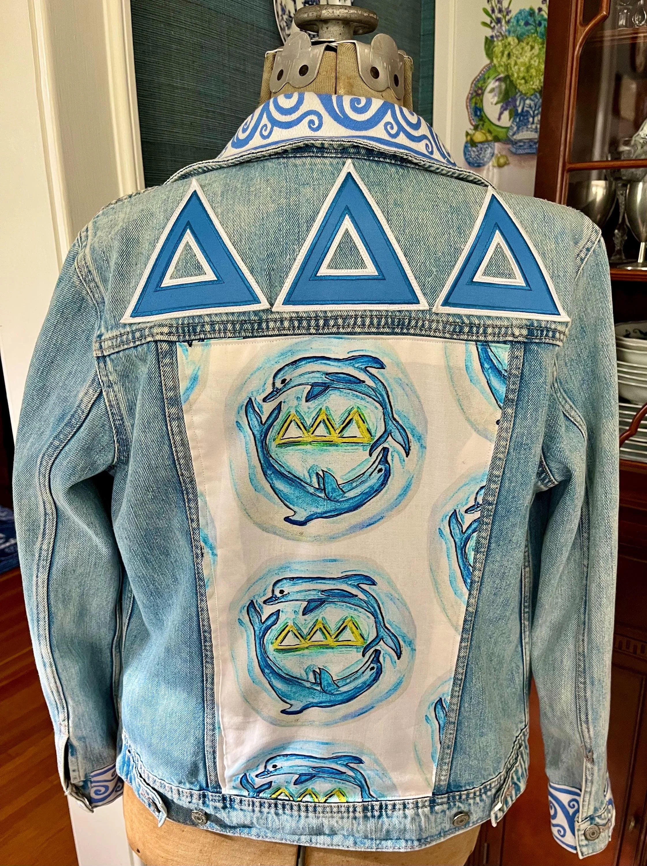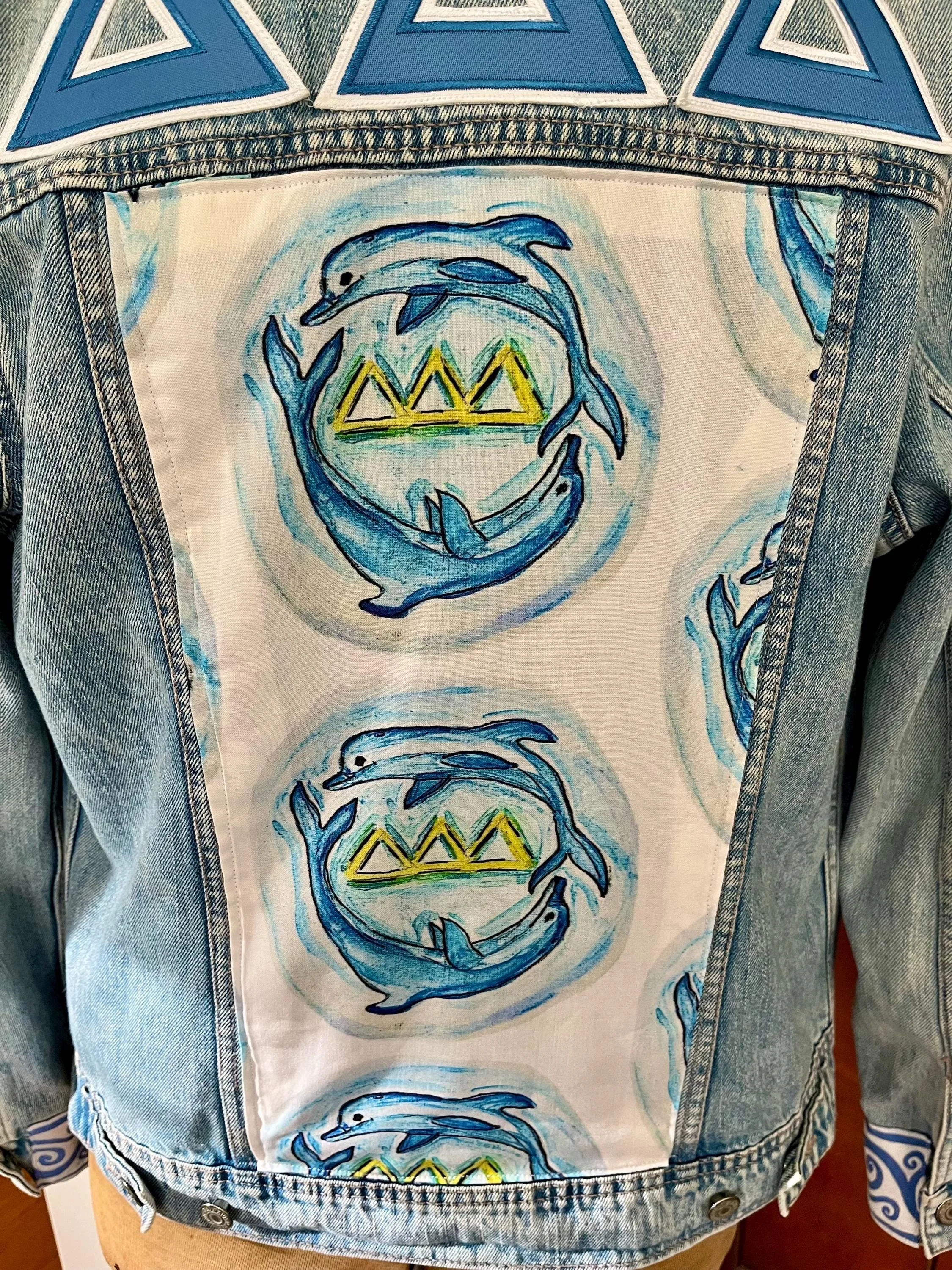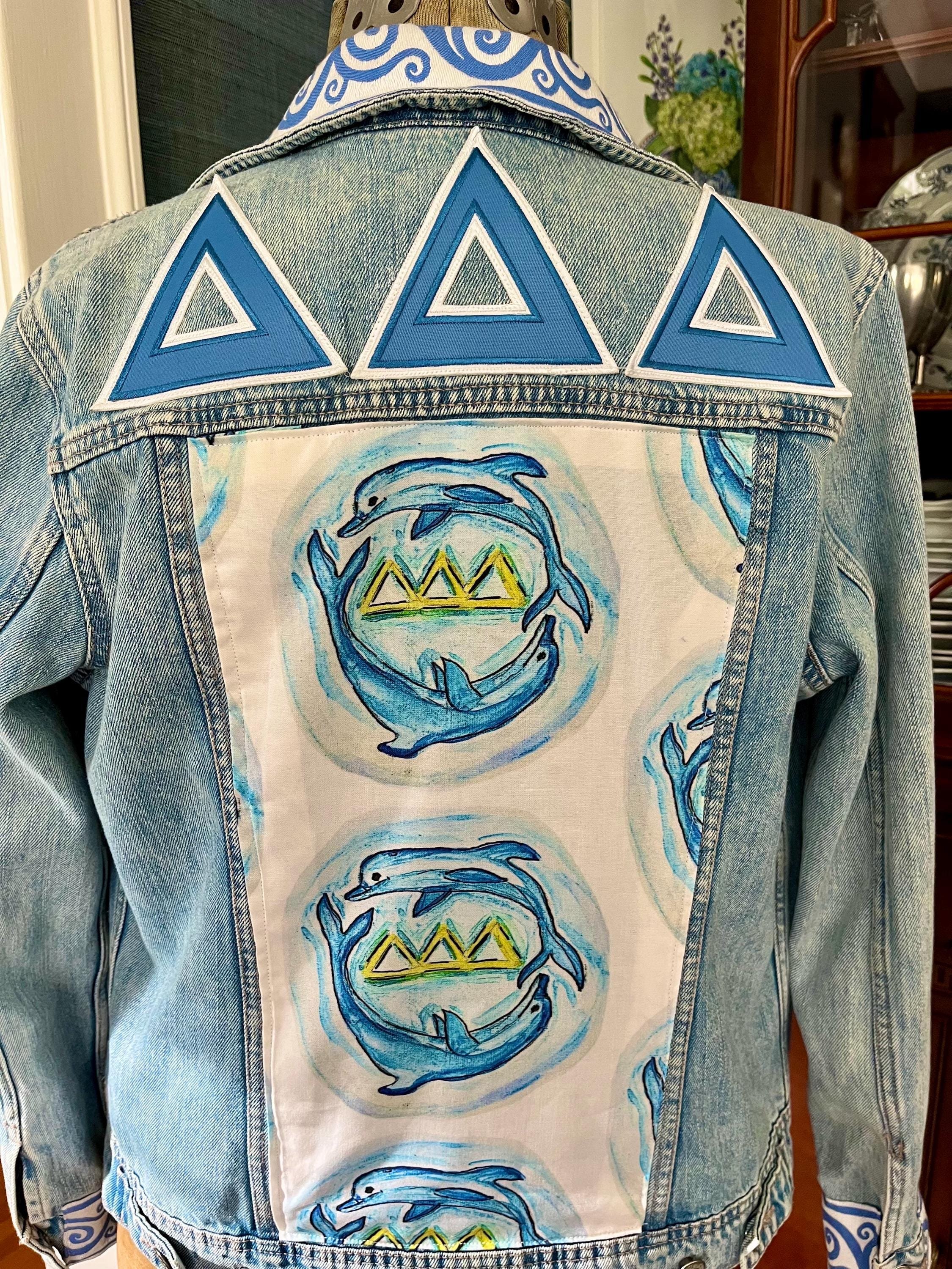 Delta Delta Delta! A classic denim jacket is embellished with any sorority’s Greek Letters as well as its crest or fabric adorned with that sorority’s signature items. This jacket (a size medium) features Delta Delta Delta and tri delta dolphin fabric paired with amazing brocade trim collar and cuffs. All sizes and sororities available with up to 4 weeks creation time. Purchasers are welcome to help in the design process. Cuffs and collar of the jacket are also embellished. PERFECT gift for any Greek member. Fraternity available via special order as well.